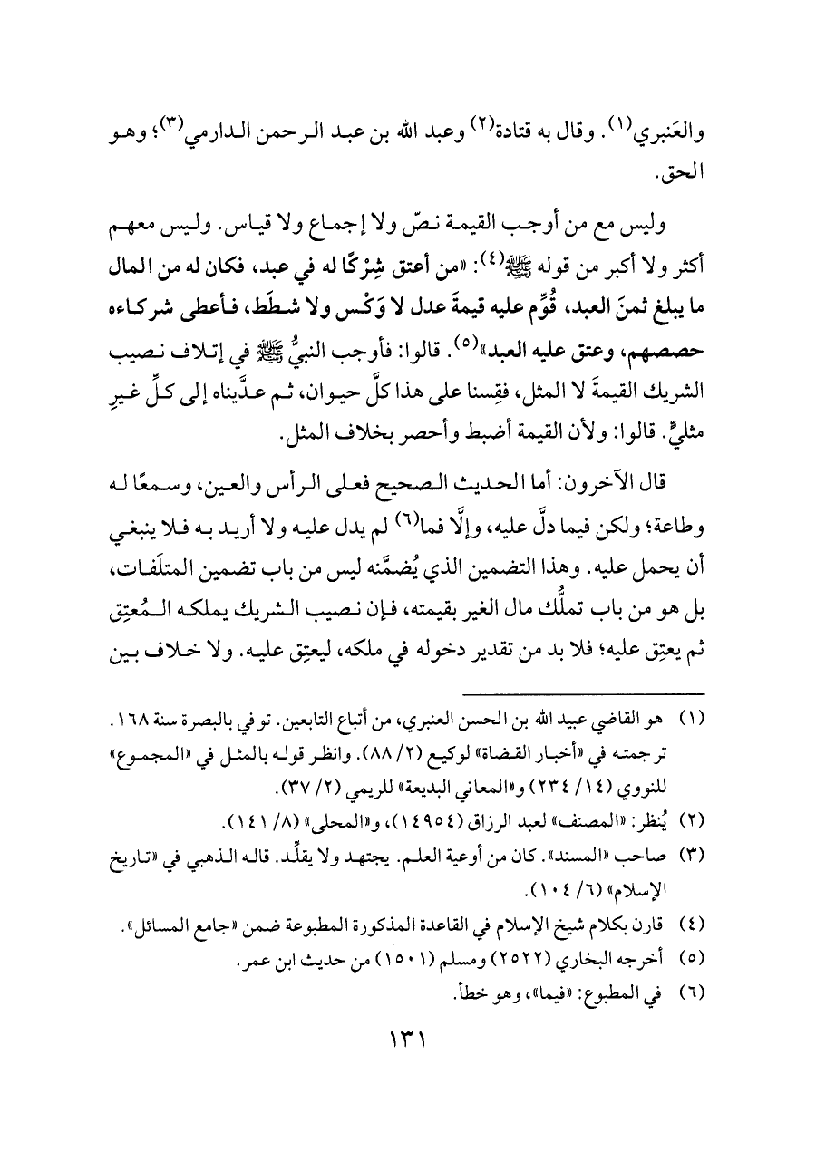 (¬١) هو القاضي عبيد الله بن الحسن العنبري، من أتباع التابعين. توفي بالبصرة سنة ١٦٨. ترجمته في «أخبار القضاة» لوكيع (٢/ ٨٨). وانظر قوله بالمثل في «المجموع» للنووي (١٤/ ٢٣٤) و «المعاني البديعة» للريمي (٢/ ٣٧).
