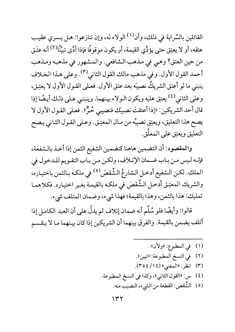 القائلين بالسِّراية في ذلك، وأن (¬١) الولاء له، وإن تنازعوا: هل يسري عقيب عتقه، أو لا يعتِق حتى يؤدِّي القيمة، أو يكون موقوفًا فإذا أدَّى تبيَّنَّا (¬٢) أنه عتَق من حين العتق؟ وهي في مذهب الشافعي. والمشهور في مذهبه ومذهب أحمد القول الأول. وفي مذهب مالك القول الثاني (¬٣). وعلى هذا الخلاف ينبني ما لو أعتق الشريكُ نصيبَه بعد عتق الأول. فعلى القول الأول لا يعتِق، وعلى الثاني (¬٤) يعتِق عليه ويكون الولاء بينهما. وينبني على ذلك أيضًا إذا قال أحد الشريكين: «إذا أعتقتَ نصيبَك فنصيبي حُرٌّ». فعلى القول الأول لا يصح هذا التعليق، ويعتِق نصيبُه من مال المعتِق. وعلى القول الثاني يصح التعليق ويعتِق على المعلِّق.
