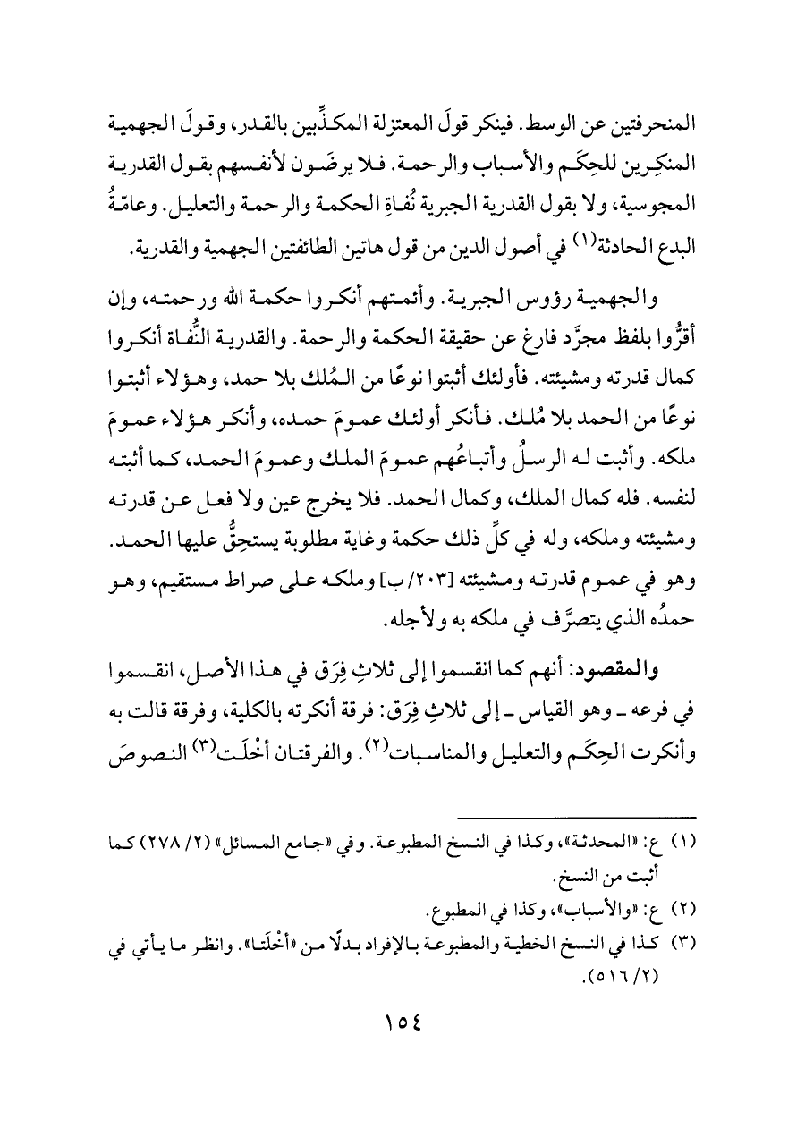 والمقصود: أنهم كما انقسموا إلى ثلاثِ فِرَق في هذا الأصل، انقسموا في فرعه ــ وهو القياس ــ إلى ثلاثِ فِرَق: فرقة أنكرته بالكلية، وفرقة قالت به وأنكرت الحِكَم والتعليل والمناسبات (¬٢). والفرقتان أخْلَت (¬٣) النصوصَ
