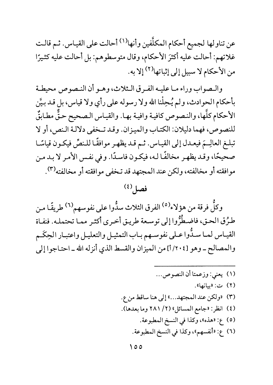 والصواب وراء ما عليه الفرق الثلاث، وهو أن النصوص محيطة بأحكام الحوادث، ولم يُحِلْنا الله ولا رسوله على رأي ولا قياس، بل قد بيَّن الأحكام كلَّها، والنصوص كافية وافية بها. والقياس الصحيح حقٌّ مطابقٌ للنصوص، فهما دليلان: الكتاب والميزان. وقد تخفى دلالة النص، أو لا تبلغ العالِمَ فيعدل إلى القياس. ثم قد يظهر موافقًا للنصِّ فيكون قياسًا صحيحًا، وقد يظهر مخالفًا له، فيكون فاسدًا. وفي نفس الأمر لا بد من موافقته أو مخالفته، ولكن عند المجتهد قد تخفى موافقته أو مخالفته (¬٣).