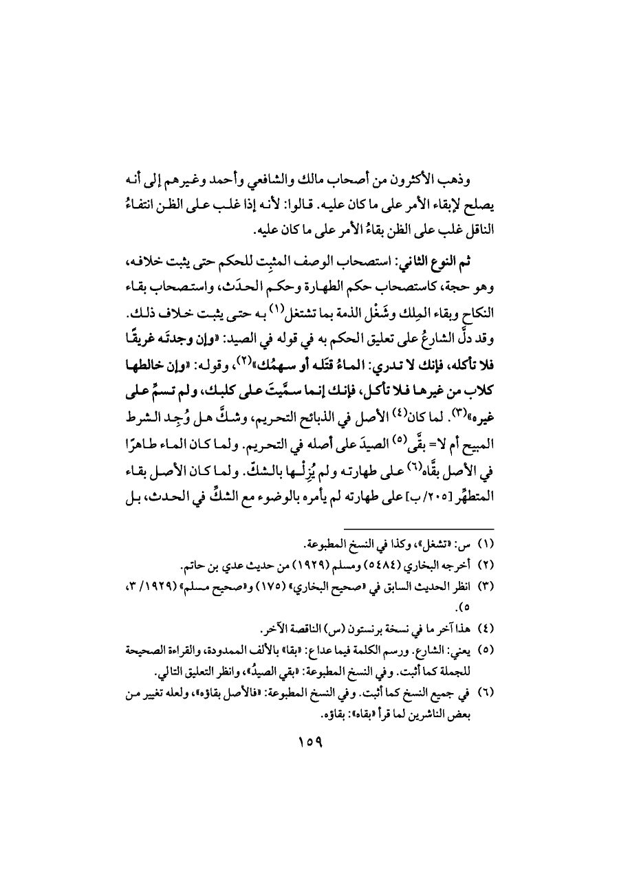ثم النوع الثاني: استصحاب الوصف المثبِت للحكم حتى يثبت خلافه، وهو حجة، كاستصحاب حكم الطهارة وحكم الحدَث، واستصحاب بقاء النكاح وبقاء المِلك وشَغْل الذمة بما تشتغل (¬١) به حتى يثبت خلاف ذلك. وقد دلَّ الشارعُ على تعليق الحكم به في قوله في الصيد: «وإن وجدتَه غريقًا فلا تأكله، فإنك لا تدري: الماءُ قتَله أو سهمُك» (¬٢)، وقوله: «وإن خالطها كلاب من غيرها فلا تأكل، فإنك إنما سمَّيتَ على كلبك، ولم تسمِّ على غيره» (¬٣). لما كان (¬٤) الأصل في الذبائح التحريم، وشكَّ هل وُجِد الشرط المبيح أم لا= بقَّى (¬٥) الصيدَ على أصله في التحريم. ولما كان الماء طاهرًا في الأصل بقَّاه (¬٦) على طهارته ولم يُزِلْها بالشكّ. ولما كان الأصل بقاء المتطهِّر [٢٠٥/ب] على طهارته لم يأمره بالوضوء مع الشكِّ في الحدث، بل