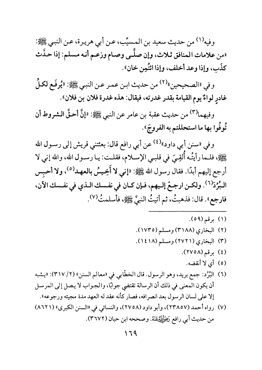 (¬٦) البُرُد: جمع بريد، وهو الرسول. قال الخطّابي في «معالم السنن» (٢/ ٣١٧): «يشبه أن يكون المعنى في ذلك أن الرسالة تقتضي جوابًا، والجواب لا يصل إلى المرسل إلا على لسان الرسول بعد انصرافه، فصار كأنه عقد له العهد مدة مجيئه ورجوعه».
