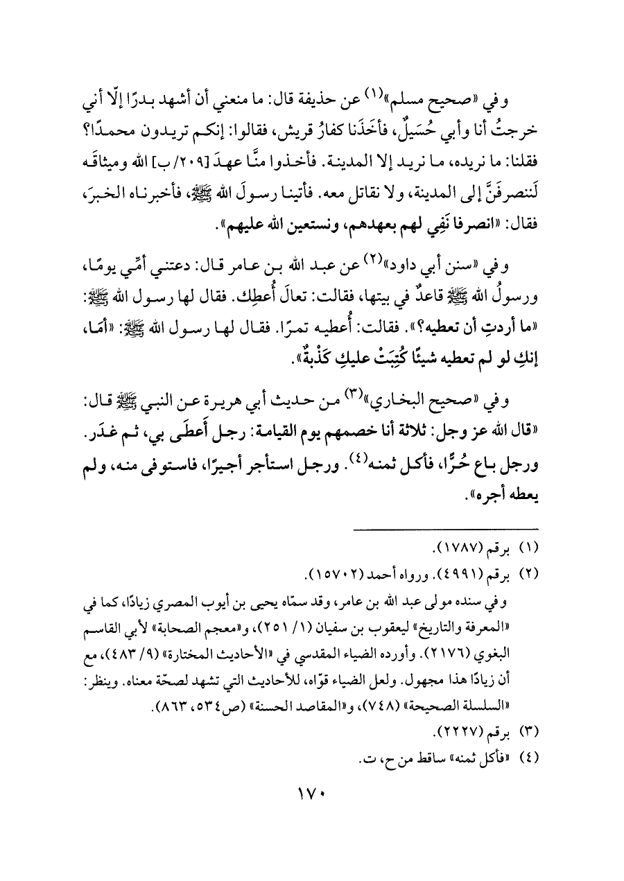 وفي «صحيح البخاري» (¬٣) من حديث أبي هريرة عن النبي - صلى الله عليه وسلم - قال: «قال الله عز وجل: ثلاثة أنا خصمهم يوم القيامة: رجل أَعطَى بي، ثم غدَر. ورجل باع حُرًّا، فأكل ثمنه (¬٤). ورجل استأجر أجيرًا، فاستوفى منه، ولم يعطه أجره».