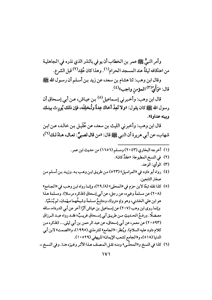 (¬٥) كذا نقله تبعًا لابن حزم في «المحلى» (٨/ ٢٩)، وإنما رواه ابن وهب في «الجامع» (٢٠٨) عن مسلمةَ وغيرِه، عن رجل، عن أبي إسحاق (فذكره مرسلا). ومسلمة هذا هو ابن علي الخشني، وهو واهٍ متروك، ومتابِعُ مسلمةَ وشيخُهما مبهَمان، لم يُسَمَّيَا.