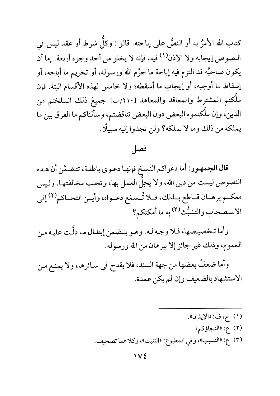 قال الجمهور: أما دعواكم النسخ فإنها دعوى باطلة، تتضمَّن أن هذه النصوص ليست من دين الله، ولا يحِلُّ العمل بها، وتجب مخالفتها. وليس معكم برهان قاطع بذلك، فلا تُسمَع دعواه، وأين التحاكم (¬٢) إلى الاستصحاب والتشبُّث (¬٣) به ما أمكنكم؟