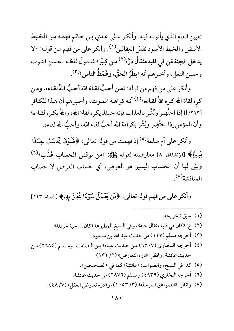 وأنكر على أم سلمة (¬٥) إذ فهمت من قوله تعالى: {فَسَوْفَ يُحَاسَبُ حِسَابًا يَسِيرًا} [الإنشقاق: ٨] معارضته لقوله - صلى الله عليه وسلم -: «من نوقش الحساب عُذِّب» (¬٦) وبيَّن لها أن الحساب اليسير هو العرض، أي حساب العرض لا حساب المناقشة (¬٧).
