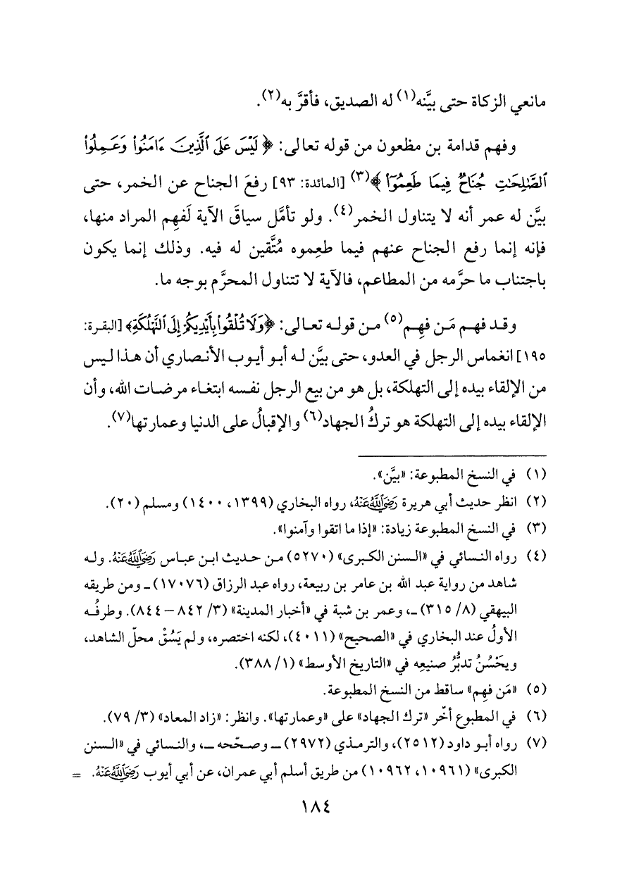 وفهم قدامة بن مظعون من قوله تعالى: {لَيْسَ عَلَى الَّذِينَ آمَنُوا وَعَمِلُوا الصَّالِحَاتِ جُنَاحٌ فِيمَا طَعِمُوا} (¬٣) [المائدة: ٩٣] رفعَ الجناح عن الخمر، حتى بيَّن له عمر أنه لا يتناول الخمر (¬٤). ولو تأمَّل سياقَ الآية لَفهِم المراد منها، فإنه إنما رفع الجناح عنهم فيما طعِموه مُتَّقين له فيه. وذلك إنما يكون باجتناب ما حرَّمه من المطاعم، فالآية لا تتناول المحرَّم بوجه ما.