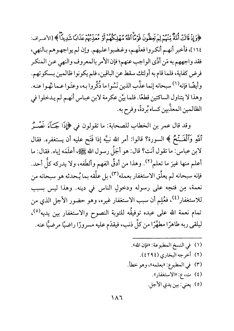 وقد قال عمر بن الخطاب للصحابة: ما تقولون في {إِذَا جَاءَ نَصْرُ اللَّهِ وَالْفَتْحُ} السورة؟ قالوا: أمر الله نبيَّه إذا فَتَح عليه أن يستغفره. فقال لابن عباس: ما تقول أنت؟ قال: هو أجَلُ رسول الله - صلى الله عليه وسلم -، أعلَمَه إياه. فقال: ما أعلم منها غيرَ ما تعلم (¬٢). وهذا من أدقِّ الفهم وألطَفه، ولا يدركه كلُّ أحد. فإنه سبحانه لم يعلِّق الاستغفار بعمله (¬٣)، بل علَّقه بما يُحدثه هو سبحانه من نعمة، مِن فتحِه على رسوله ودخولِ الناس في دينه. وهذا ليس بسبب للاستغفار (¬٤)، فعُلِم أن سبب الاستغفار غيره، وهو حضور الأجل الذي من تمام نعمة الله على عبده توفيقُه للتوبة النصوح والاستغفار بين يديه (¬٥)، ليلقى ربه طاهرًا مطهَّرًا من كلِّ ذنب، فيقدَم عليه مسرورًا راضيًا مرضيًّا عنه.