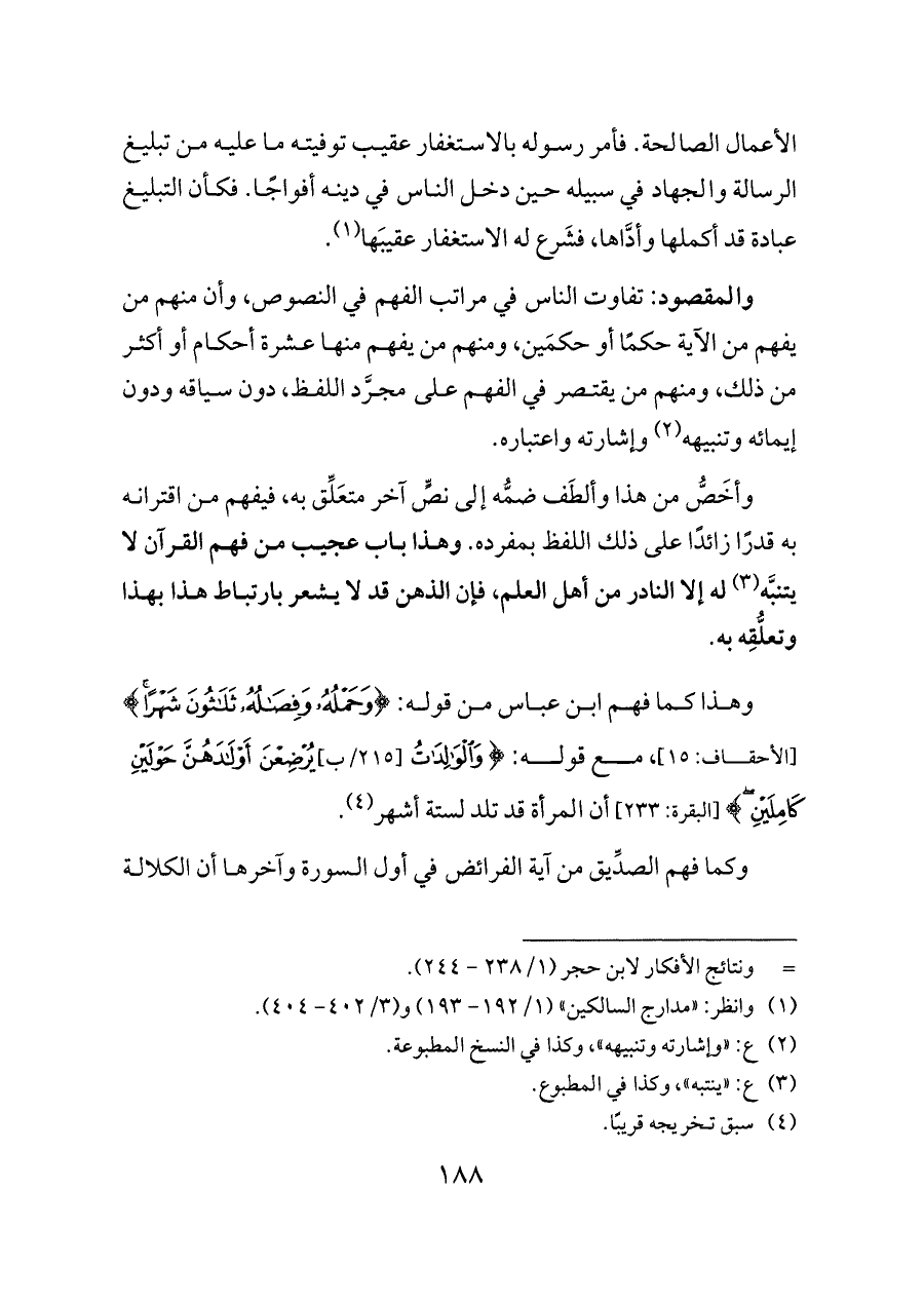 وهذا كما فهم ابن عباس من قوله: {وَحَمْلُهُ وَفِصَالُهُ ثَلَاثُونَ شَهْرًا} [الأحقاف: ١٥]، مع قوله: {وَالْوَالِدَاتُ [٢١٥/ب] يُرْضِعْنَ أَوْلَادَهُنَّ حَوْلَيْنِ كَامِلَيْنِ} [البقرة: ٢٣٣] أن المرأة قد تلد لستة أشهر (¬٤).
