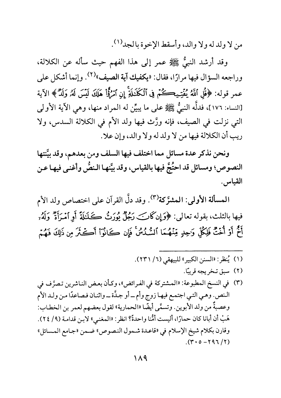 وقد أرشد النبيُّ - صلى الله عليه وسلم - عمر إلى هذا الفهم حيث سأله عن الكلالة، وراجعه السؤال فيها مرارًا، فقال: «يكفيك آية الصيف» (¬٢). وإنما أشكل على عمر قوله: {قُلِ اللَّهُ يُفْتِيكُمْ فِي الْكَلَالَةِ إِنِ امْرُؤٌ هَلَكَ لَيْسَ لَهُ وَلَدٌ} الآية [النساء: ١٧٦]، فدلَّه النبيُّ - صلى الله عليه وسلم - على ما يبيِّن له المراد منها، وهي الآية الأولى التي نزلت في الصيف، فإنه ورَّث فيها ولد الأم في الكلالة السدس، ولا ريب أن الكلالة فيها من لا ولد له ولا والد، وإن علا.