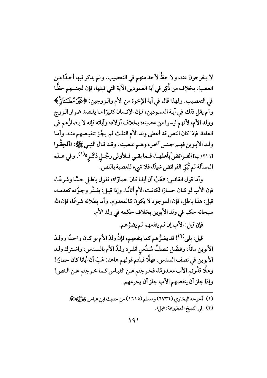 لا يخرجون عنه، ولا حظَّ لأحد منهم في التعصيب. ولم يذكر فيها أحدًا من العصبة، بخلاف من ذُكِر في آية العمودين الآية التي قبلها، فإن لجنسهم حظًّا في التعصيب. ولهذا قال في آية الإخوة من الأم والزوجين: {غَيْرَ مُضَارٍّ} ولم يقل ذلك في آية العمودين، فإن الإنسان كثيرًا ما يقصد ضرار الزوج وولد الأم، لأنهم ليسوا من عصبته؛ بخلاف أولاده وآبائه فإنه لا يضارُّهم في العادة. فإذا كان النص قد أعطى ولد الأم الثلث لم يجُز تنقيصهم منه. وأما ولد الأبوين فهم جنس آخر، وهم عصبته، وقد قال النبي - صلى الله عليه وسلم -: «ألحِقُوا [٢١٦/ب] الفرائضَ بأهلها، فما بقي فلأولى رجُلٍ ذكَرٍ» (¬١). وفي هذه المسألة لم تُبْقِ الفرائض شيئًا، فلا شيء للعصبة بالنص.