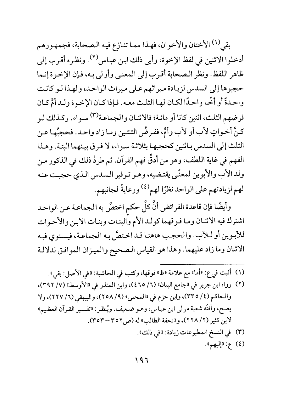 بقي (¬١) الأختان والأخوان، فهذا مما تنازع فيه الصحابة، فجمهورهم أدخلوا الاثنين في لفظ الإخوة، وأبى ذلك ابن عباس (¬٢). ونظره أقرب إلى ظاهر اللفظ. ونظر الصحابة أقرب إلى المعنى وأولى به، فإن الإخوة إنما حجبوها إلى السدس لزيادة ميراثهم على ميراث الواحد، ولهذا لو كانت واحدةً أو أخًا واحدًا لكان لها الثلث معه. فإذا كان الإخوة ولد أمٍّ كان فرضهم الثلث، اثنين كانا أو مائة؛ فالاثنان والجماعة (¬٣) سواء. وكذلك لو كنَّ أخواتٍ لأب أو لأب وأمٍّ، ففرضُ الثنتين وما زاد واحد. فحجبُها عن الثلث إلى السدس باثنين كحجبها بثلاثة سواء، لا فرق بينهما البتة. وهذا الفهم في غاية اللطف، وهو من أدقِّ فهم القرآن. ثم طردُ ذلك في الذكور من ولد الأب والأبوين لمعنًى يقتضيه، وهو توفير السدس الذي حجبت عنه لهم لزيادتهم على الواحد نظرًا لهم (¬٤) ورعايةً لجانبهم.