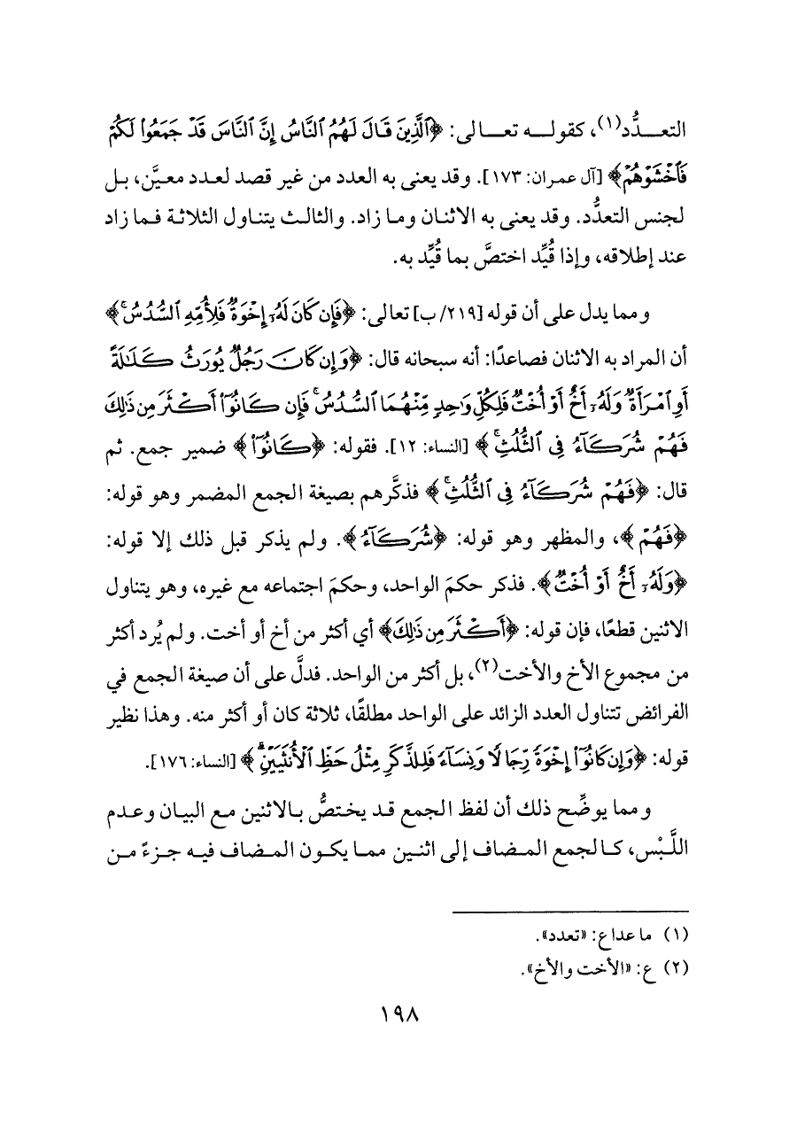 ومما يدل على أن قوله [٢١٩/ب] تعالى: {فَإِنْ كَانَ لَهُ إِخْوَةٌ فَلِأُمِّهِ السُّدُسُ} أن المراد به الاثنان فصاعدًا: أنه سبحانه قال: {وَإِنْ كَانَ رَجُلٌ يُورَثُ كَلَالَةً أَوِ امْرَأَةٌ وَلَهُ أَخٌ أَوْ أُخْتٌ فَلِكُلِّ وَاحِدٍ مِنْهُمَا السُّدُسُ فَإِنْ كَانُوا أَكْثَرَ مِنْ ذَلِكَ فَهُمْ شُرَكَاءُ فِي الثُّلُثِ} [النساء: ١٢]. فقوله: {كَانُوا} ضمير جمع. ثم قال: {فَهُمْ شُرَكَاءُ فِي الثُّلُثِ} فذكَّرهم بصيغة الجمع المضمر وهو قوله: {فَهُمْ}، والمظهر وهو قوله: {شُرَكَاءُ}. ولم يذكر قبل ذلك إلا قوله: {وَلَهُ أَخٌ أَوْ أُخْتٌ}. فذكر حكمَ الواحد، وحكمَ اجتماعه مع غيره، وهو يتناول الاثنين قطعًا، فإن قوله: {أَكْثَرَ مِنْ ذَلِكَ} أي أكثر من أخ أو أخت. ولم يُرد أكثر من مجموع الأخ والأخت (¬٢)، بل أكثر من الواحد. فدلَّ على أن صيغة الجمع في الفرائض تتناول العدد الزائد على الواحد مطلقًا، ثلاثة كان أو أكثر منه. وهذا نظير قوله: {وَإِنْ كَانُوا إِخْوَةً رِجَالًا وَنِسَاءً فَلِلذَّكَرِ مِثْلُ حَظِّ الْأُنْثَيَيْنِ} [النساء: ١٧٦].