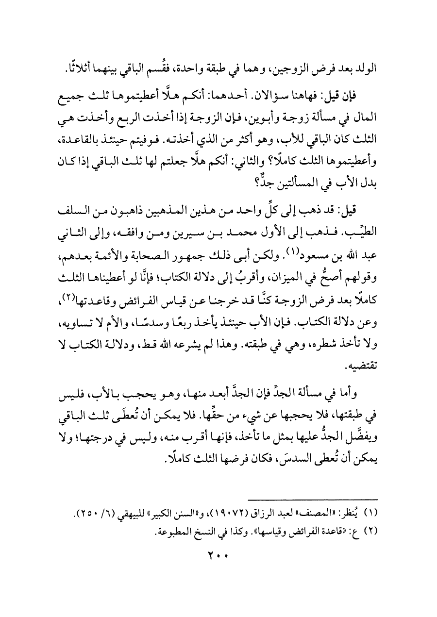 قيل: قد ذهب إلى كلِّ واحد من هذين المذهبين ذاهبون من السلف الطيِّب. فذهب إلى الأول محمد بن سيرين ومن وافقه، وإلى الثاني عبد الله بن مسعود (¬١). ولكن أبى ذلك جمهور الصحابة والأئمة بعدهم، وقولهم أصحُّ في الميزان، وأقربُ إلى دلالة الكتاب؛ فإنَّا لو أعطيناها الثلث كاملًا بعد فرض الزوجة كنَّا قد خرجنا عن قياس الفرائض وقاعدتها (¬٢)، وعن دلالة الكتاب. فإن الأب حينئذ يأخذ ربعًا وسدسًا، والأم لا تساويه، ولا تأخذ شطره، وهي في طبقته. وهذا لم يشرعه الله قط، ودلالة الكتاب لا تقتضيه.