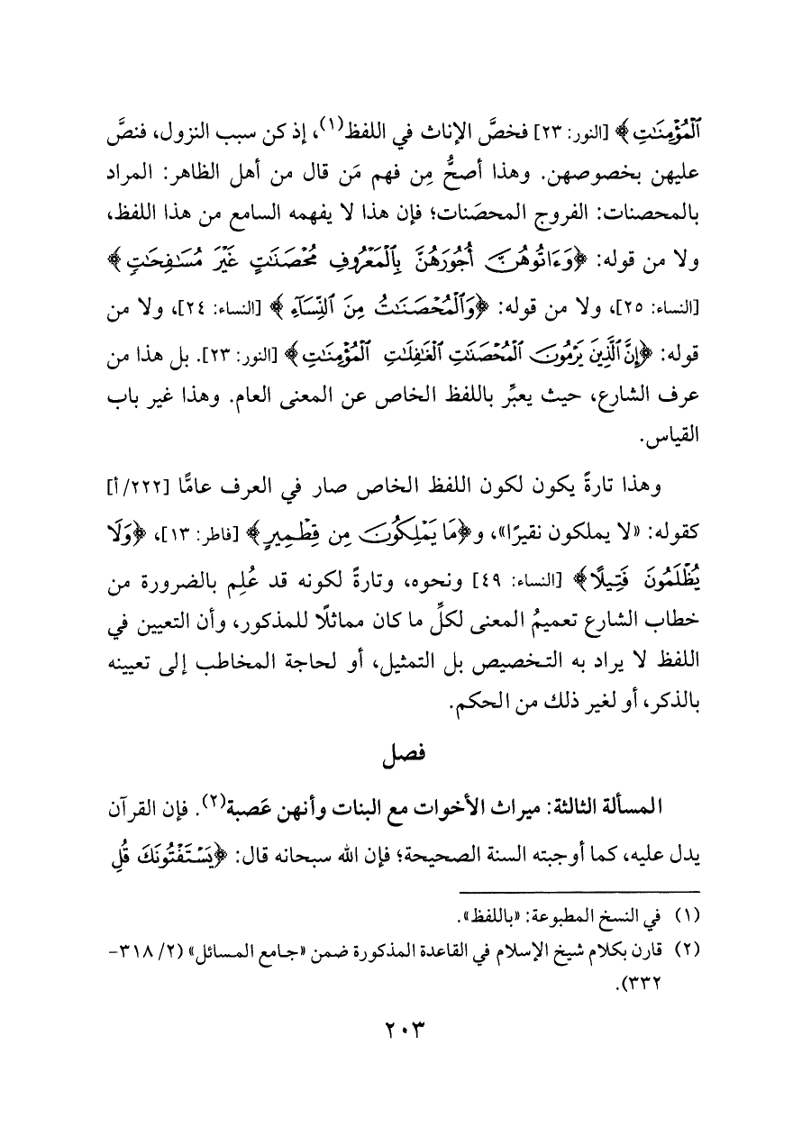 الْمُؤْمِنَاتِ} [النور: ٢٣] فخصَّ الإناث في اللفظ (¬١)، إذ كن سبب النزول، فنصَّ عليهن بخصوصهن. وهذا أصحُّ مِن فهم مَن قال من أهل الظاهر: المراد بالمحصنات: الفروج المحصَنات؛ فإن هذا لا يفهمه السامع من هذا اللفظ، ولا من قوله: {وَآتُوهُنَّ أُجُورَهُنَّ بِالْمَعْرُوفِ مُحْصَنَاتٍ غَيْرَ مُسَافِحَاتٍ} [النساء: ٢٥]، ولا من قوله: {وَالْمُحْصَنَاتُ مِنَ النِّسَاءِ} [النساء: ٢٤]، ولا من قوله: {إِنَّ الَّذِينَ يَرْمُونَ الْمُحْصَنَاتِ الْغَافِلَاتِ الْمُؤْمِنَاتِ} [النور: ٢٣]. بل هذا من عرف الشارع، حيث يعبِّر باللفظ الخاص عن المعنى العام. وهذا غير باب القياس.