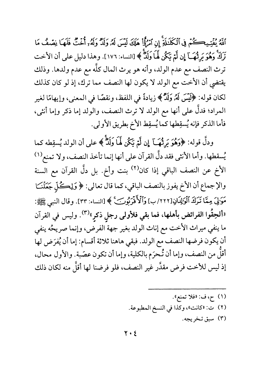 ودلَّ قوله: {وَهُوَ يَرِثُهَا إِنْ لَمْ يَكُنْ لَهَا وَلَدٌ} على أن الولد يُسقِطه كما يُسقطها. وأما الأنثى فقد دلَّ القرآن على أنها إنما تأخذ النصف، ولا تمنع (¬١) الأخ عن النصف الباقي إذا كان (¬٢) بنت وأخ. بل دلَّ القرآن مع السنة والإجماع أن الأخ يفوز بالنصف الباقي، كما قال تعالى: {وَلِكُلٍّ جَعَلْنَا مَوَالِيَ مِمَّا تَرَكَ الْوَالِدَانِ [٢٢٢/ب] ... وَالْأَقْرَبُونَ} [النساء: ٣٣]. وقال النبي - صلى الله عليه وسلم -: «ألحِقُوا الفرائض بأهلها، فما بقي فلأولى رجلٍ ذكرٍ» (¬٣). وليس في القرآن ما ينفي ميراث الأخت مع إناث الولد بغير جهة الفرض، وإنما صريحُه ينفي أن يكون فرضها النصف مع الولد. فبقي هاهنا ثلاثة أقسام: إما أن يُفرَض لها أقلُّ من النصف، وإما أن تُحرَم بالكلية، وإما أن تكون عصَبة. والأول محال، إذ ليس للأخت فرض مقدَّر غير النصف، فلو فرضنا لها أقلَّ منه لكان ذلك