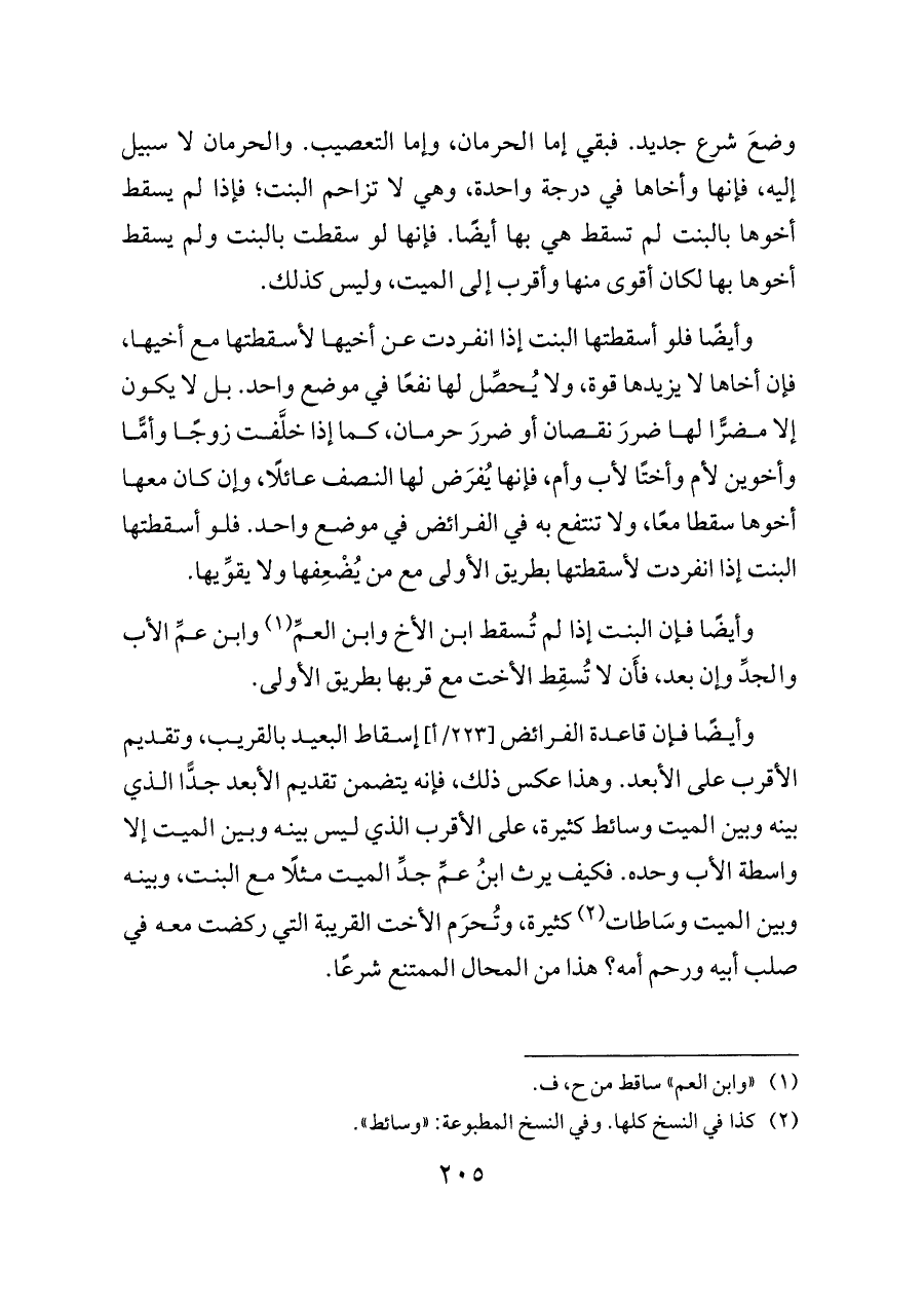 وضعَ شرع جديد. فبقي إما الحرمان، وإما التعصيب. والحرمان لا سبيل إليه، فإنها وأخاها في درجة واحدة، وهي لا تزاحم البنت؛ فإذا لم يسقط أخوها بالبنت لم تسقط هي بها أيضًا. فإنها لو سقطت بالبنت ولم يسقط أخوها بها لكان أقوى منها وأقرب إلى الميت، وليس كذلك.