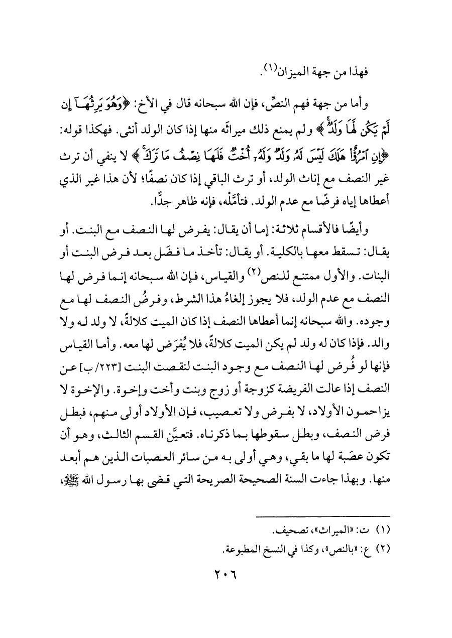 وأما من جهة فهم النصِّ، فإن الله سبحانه قال في الأخ: {وَهُوَ يَرِثُهَا إِنْ لَمْ يَكُنْ لَهَا وَلَدٌ} ولم يمنع ذلك ميراثَه منها إذا كان الولد أنثى. فهكذا قوله: {إِنِ امْرُؤٌ هَلَكَ لَيْسَ لَهُ وَلَدٌ وَلَهُ أُخْتٌ فَلَهَا نِصْفُ مَا تَرَكَ} لا ينفي أن ترث غير النصف مع إناث الولد، أو ترث الباقي إذا كان نصفًا؛ لأن هذا غير الذي أعطاها إياه فرضًا مع عدم الولد. فتأمَّلْه، فإنه ظاهر جدًّا.