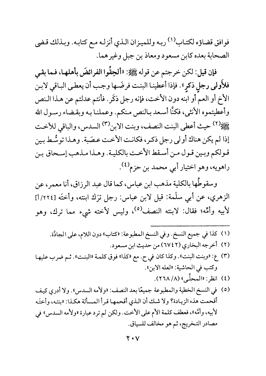 (¬٥) في النسخ الخطية والمطبوعة جميعًا بعد النصف: «ولأمه السدس». ولا أدري كيف أقحمت هذه الزيادة؟ ولا شك أن الذي أقحمها قرأ المسألة هكذا: «بنته، وأختَه لأبيه، وأمَّه»، فعطف كلمة الأم على الأخت. ولكن لم ترد عبارة «ولأمه السدس» في مصادر التخريج، ثم هو مخالف للسياق.