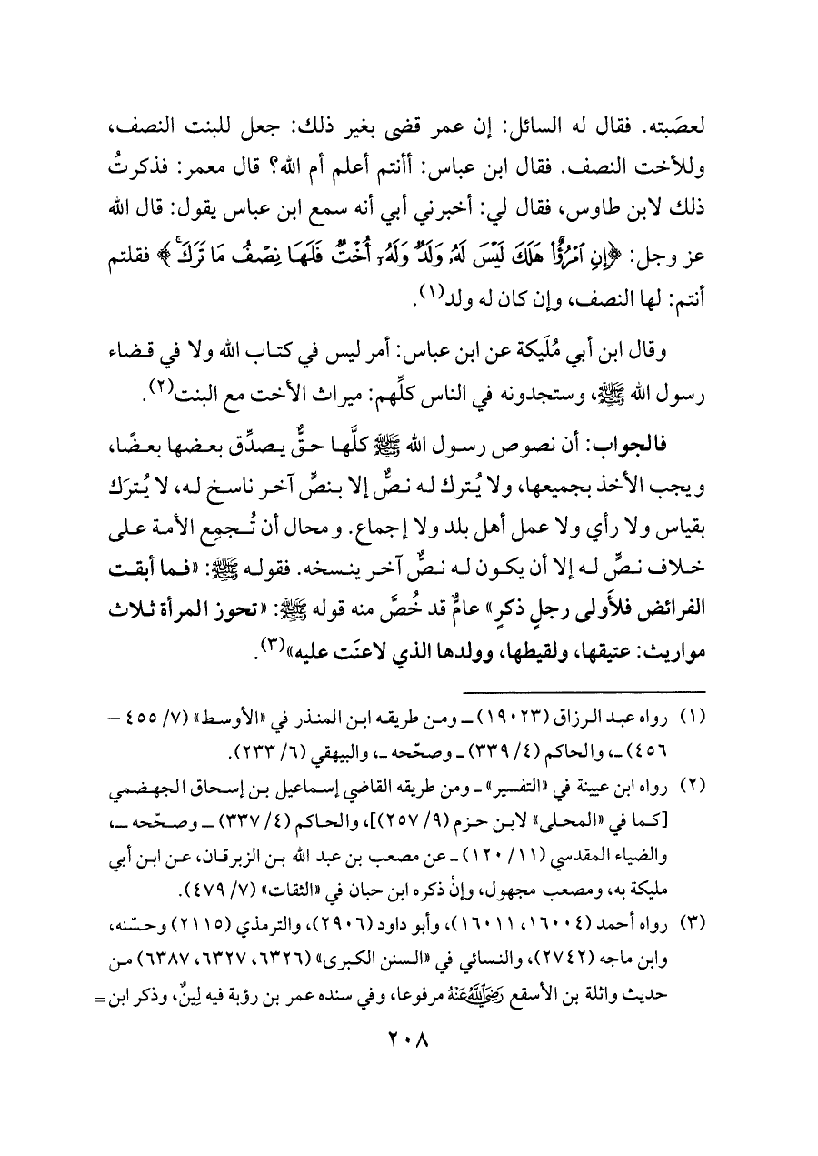 فالجواب: أن نصوص رسول الله - صلى الله عليه وسلم - كلَّها حقٌّ يصدِّق بعضها بعضًا، ويجب الأخذ بجميعها، ولا يُترك له نصٌّ إلا بنصٍّ آخر ناسخ له، لا يُترَك بقياس ولا رأي ولا عمل أهل بلد ولا إجماع. ومحال أن تُجمِع الأمة على خلاف نصٍّ له إلا أن يكون له نصٌّ آخر ينسخه. فقوله - صلى الله عليه وسلم -: «فما أبقت الفرائض فلأَولى رجلٍ ذكرٍ» عامٌّ قد خُصَّ منه قوله - صلى الله عليه وسلم -: «تحوز المرأة ثلاث مواريث: عتيقها، ولقيطها، وولدها الذي لاعنَت عليه» (¬٣).