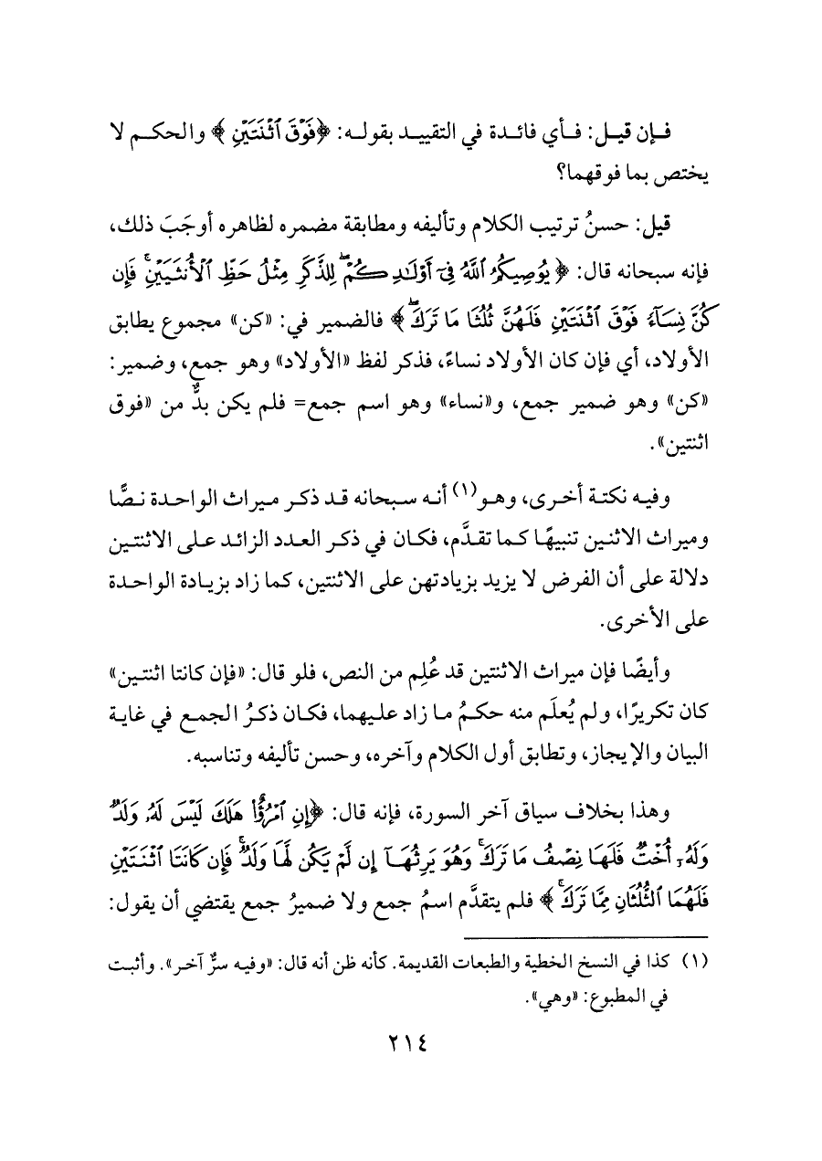 وأيضًا فإن ميراث الاثنتين قد عُلِم من النص، فلو قال: «فإن كانتا اثنتين» كان تكريرًا، ولم يُعلَم منه حكمُ ما زاد عليهما، فكان ذكرُ الجمع في غاية البيان والإيجاز، وتطابق أول الكلام وآخره، وحسن تأليفه وتناسبه.