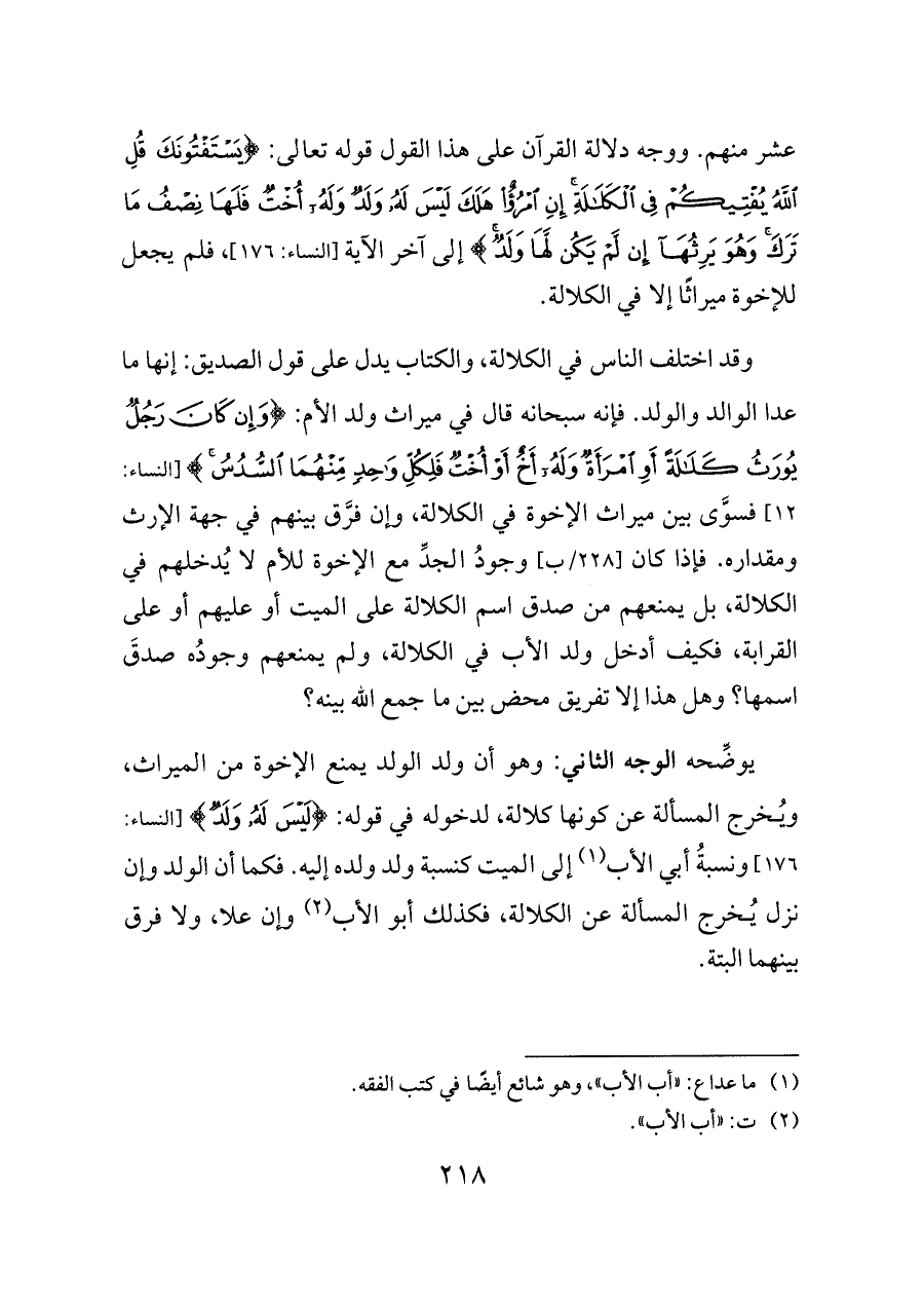 يوضِّحه الوجه الثاني: وهو أن ولد الولد يمنع الإخوة من الميراث، ويُخرج المسألة عن كونها كلالة، لدخوله في قوله: {لَيْسَ لَهُ وَلَدٌ} [النساء: ١٧٦] ونسبةُ أبي الأب (¬١) إلى الميت كنسبة ولد ولده إليه. فكما أن الولد وإن نزل يُخرج المسألة عن الكلالة، فكذلك أبو الأب (¬٢) وإن علا، ولا فرق بينهما البتة.