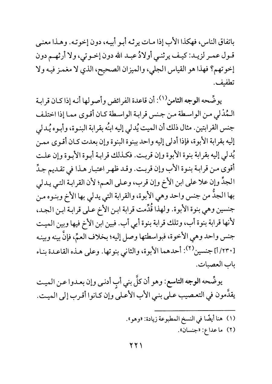 يوضِّحه الوجه الثامن (¬١): أن قاعدة الفرائض وأصولها أنه إذا كان قرابة المُدْلي من الواسطة من جنس قرابة الواسطة كان أقوى مما إذا اختلف جنس القرابتين. مثال ذلك أن الميت يُدلي إليه ابنُه بقرابة البنوة، وأبوه يُدلي إليه بقرابة الأبوة، فإذا أدلى إليه واحد ببنوة البنوة وإن بعدت كان أقوى ممن يُدلي إليه بقرابة بنوة الأبوة وإن قربت. فكذلك قرابة أبوة الأبوة وإن علت أقوى من قرابة بنوة الأب وإن قربت. وقد ظهر اعتبار هذا في تقديم جدِّ الجدِّ وإن علا على ابن الأخ وإن قرب، وعلى العم؛ لأن القرابة التي يدلي بها الجدُّ من جنس واحد وهي الأبوة، والقرابة التي يدلي بها الأخ وبنوه من جنسين وهي بنوة الأبوة. ولهذا قُدِّمت قرابة ابن الأخ على قرابة ابن الجد، لأنها قرابة بنوة أب، وتلك قرابة بنوة أبي أب. فبين ابن الأخ فيها وبين الميت جنس واحد وهي الأخوة، فبواسطتها وصل إليه؛ بخلاف العمِّ، فإنَّ بينه وبينه [٢٣٠/أ] جنسين (¬٢): أحدهما الأبوة، والثاني بنوتها. وعلى هذه القاعدة بناء باب العصبات.