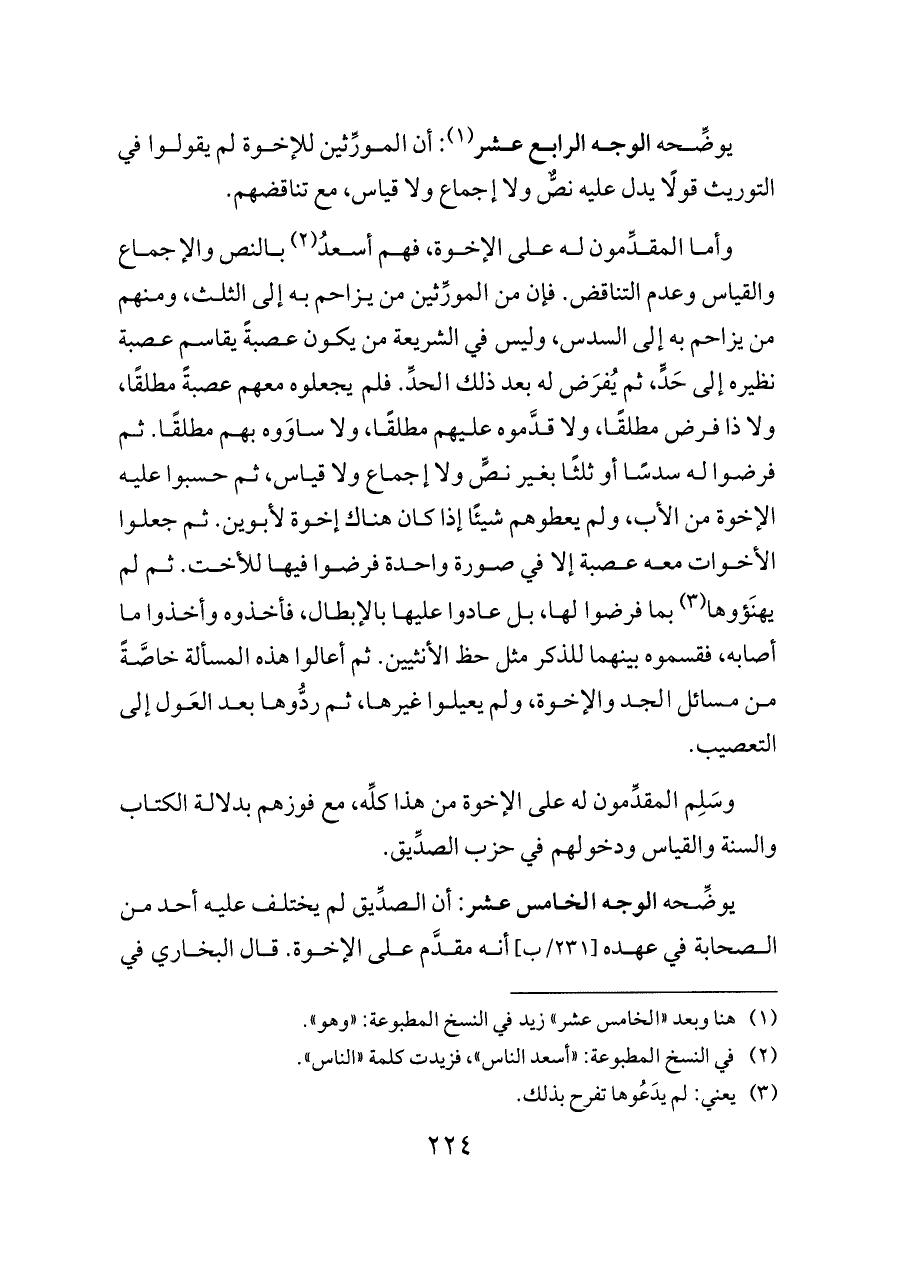 يوضِّحه الوجه الخامس عشر: أن الصدِّيق لم يختلف عليه أحد من الصحابة في عهده [٢٣١/ب] أنه مقدَّم على الإخوة. قال البخاري في
