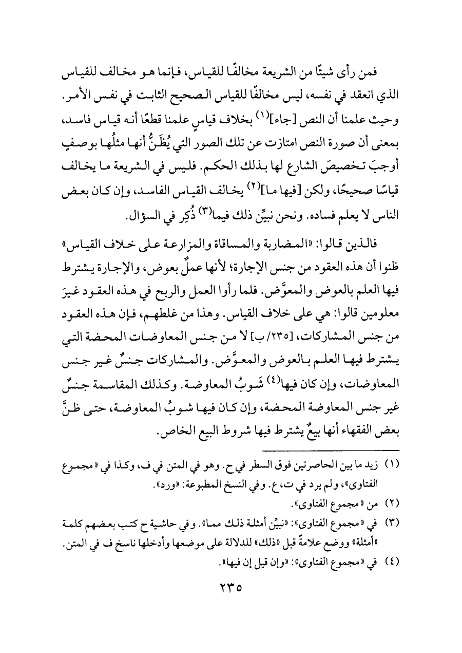 فالذين قالوا: «المضاربة والمساقاة والمزارعة على خلاف القياس» ظنوا أن هذه العقود من جنس الإجارة؛ لأنها عملٌ بعوض، والإجارة يشترط فيها العلم بالعوض والمعوَّض. فلما رأوا العمل والربح في هذه العقود غيرَ معلومين قالوا: هي على خلاف القياس. وهذا من غلطهم، فإن هذه العقود من جنس المشاركات، [٢٣٥/ب] لا من جنس المعاوضات المحضة التي يشترط فيها العلم بالعوض والمعوَّض. والمشاركات جنسٌ غير جنس المعاوضات، وإن كان فيها (¬٤) شَوبُ المعاوضة. وكذلك المقاسمة جنسٌ غير جنس المعاوضة المحضة، وإن كان فيها شوبُ المعاوضة، حتى ظنَّ بعض الفقهاء أنها بيعٌ يشترط فيها شروط البيع الخاص.