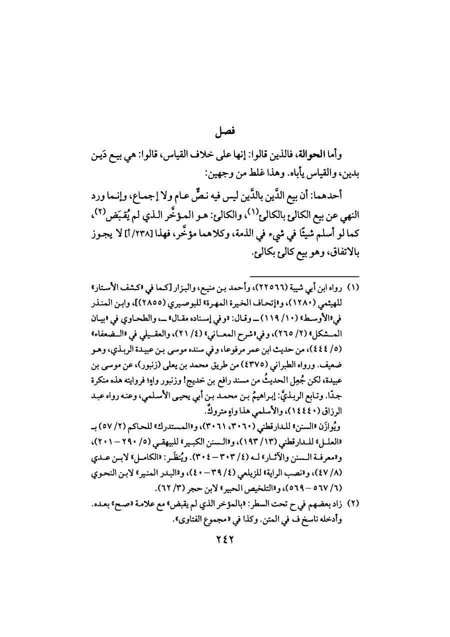 أحدهما: أن بيع الدَّين بالدَّين ليس فيه نصٌّ عام ولا إجماع، وإنما ورد النهي عن بيع الكالئ بالكالئ (¬١)، والكالئ: هو المؤخَّر الذي لم يُقبَض (¬٢)، كما لو أسلم شيئًا في شيء في الذمة، وكلاهما مؤخَّر، فهذا [٢٣٨/أ] لا يجوز بالاتفاق، وهو بيع كالئ بكالئ.