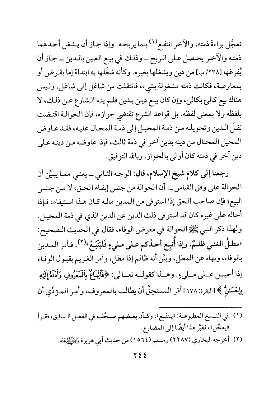 تعجَّل براءةَ ذمته، والآخر انتفع (¬١) بما يربحه. وإذا جاز أن يشغل أحدهما ذمته والآخر يحصل على الربح ــ وذلك في بيع العين بالدين ــ جاز أن يُفرغها [٢٣٨/ب] من دين ويشغلها بغيره. وكأنه شغَلها به ابتداءً إما بقرض أو بمعاوضة، فكانت ذمته مشغولة بشيء، فانتقلت من شاغل إلى شاغل. وليس هناك بيع كالئ بكالئ، وإن كان بيع دين بدين فلم ينه الشارع عن ذلك، لا بلفظه ولا بمعنى لفظه. بل قواعد الشرع تقتضي جوازه، فإن الحوالة اقتضت نقلَ الدين وتحويله من ذمة المحيل إلى ذمة المحال عليه، فقد عاوض المحيل المحتال من دينه بدين آخر في ذمة ثالث، فإذا عاوضه من دينه على دين آخر في ذمته كان أولى بالجواز. وبالله التوفيق.