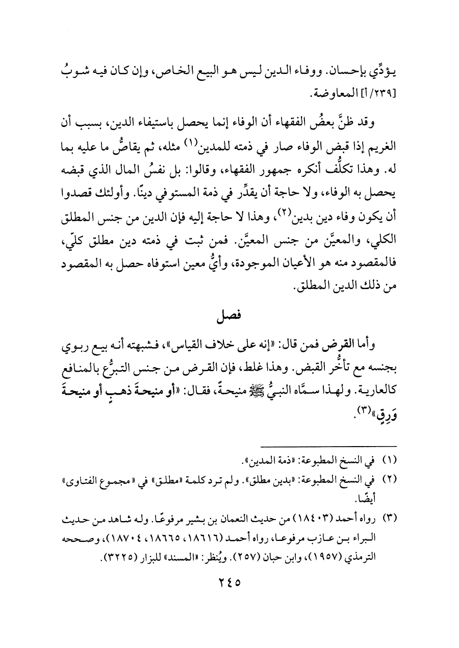 وقد ظنَّ بعضُ الفقهاء أن الوفاء إنما يحصل باستيفاء الدين، بسبب أن الغريم إذا قبض الوفاء صار في ذمته للمدين (¬١) مثله، ثم يقاصُّ ما عليه بما له. وهذا تكلُّف أنكره جمهور الفقهاء، وقالوا: بل نفسُ المال الذي قبضه يحصل به الوفاء، ولا حاجة أن يقدِّر في ذمة المستوفي دينًا. وأولئك قصدوا أن يكون وفاء دين بدين (¬٢)، وهذا لا حاجة إليه فإن الدين من جنس المطلق الكلي، والمعيَّن من جنس المعيَّن. فمن ثبت في ذمته دين مطلق كلّي، فالمقصود منه هو الأعيان الموجودة، وأيُّ معين استوفاه حصل به المقصود من ذلك الدين المطلق.