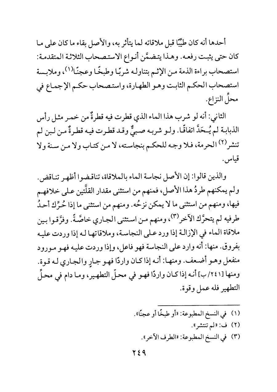 أحدها أنه كان طيِّبًا قبل ملاقاته لما يتأثر به، والأصل بقاء ما كان على ما كان حتى يثبت رفعه. وهذا يتضمَّن أنواع الاستصحاب الثلاثة المتقدمة: استصحاب براءة الذمة من الإثم بتناوله شربًا وطبخًا وعجنًا (¬١)، وملابسة استصحاب الحكم الثابت وهو الطهارة، واستصحاب حكم الإجماع في محلِّ النزاع.