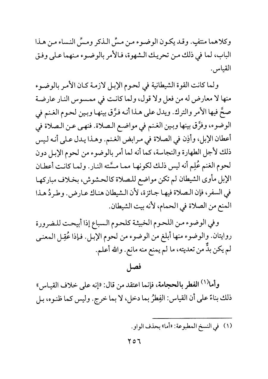 ولما كانت القوة الشيطانية في لحوم الإبل لازمة كان الأمر بالوضوء منها لا معارض له من فعل ولا قول، ولما كانت في ممسوس النار عارضة صحَّ فيها الأمر والترك. ويدل على هذا أنه فرَّق بينها وبين لحوم الغنم في الوضوء، وفرَّق بينها وبين الغنم في مواضع الصلاة. فنهى عن الصلاة في أعطان الإبل، وأذِن في الصلاة في مرابض الغنم. وهذا يدل على أنه ليس ذلك لأجل الطهارة والنجاسة، كما أنه لما أمر بالوضوء من لحوم الإبل دون لحوم الغنم عُلِم أنه ليس ذلك لكونها مما مسَّته النار. ولما كانت أعطان الإبل مأوى الشيطان لم تكن مواضع للصلاة كالحشوش، بخلاف مباركها في السفر، فإن الصلاة فيها جائزة، لأن الشيطان هناك عارض. وطردُ هذا المنع من الصلاة في الحمام، لأنه بيت الشيطان.