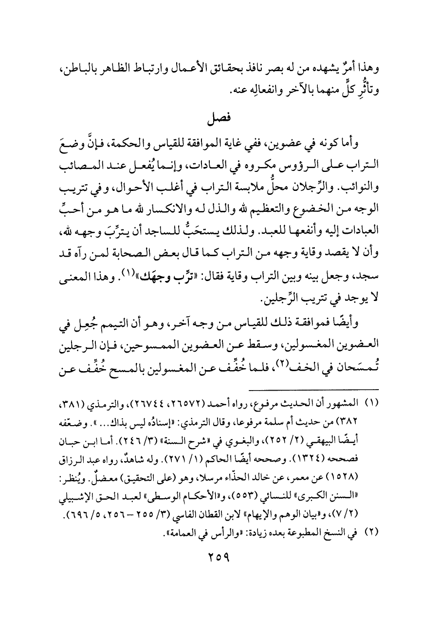 وأما كونه في عضوين، ففي غاية الموافقة للقياس والحكمة، فإنَّ وضعَ التراب على الرؤوس مكروه في العادات، وإنما يُفعل عند المصائب والنوائب. والرِّجلان محلُّ ملابسة التراب في أغلب الأحوال، وفي تتريب الوجه من الخضوع والتعظيم لله والذل له والانكسار لله ما هو من أحبِّ العبادات إليه وأنفعها للعبد. ولذلك يستحَبُّ للساجد أن يترِّبَ وجهه لله، وأن لا يقصد وقاية وجهه من التراب كما قال بعض الصحابة لمن رآه قد سجد، وجعل بينه وبين التراب وقاية فقال: «ترِّب وجهَك» (¬١). وهذا المعنى لا يوجد في تتريب الرِّجلين.