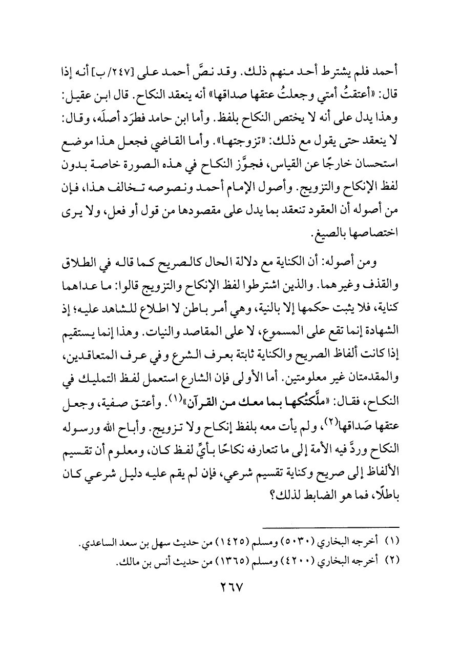 أحمد فلم يشترط أحد منهم ذلك. وقد نصَّ أحمد على [٢٤٧/ب] أنه إذا قال: «أعتقتُ أمتي وجعلتُ عتقها صداقها» أنه ينعقد النكاح. قال ابن عقيل: وهذا يدل على أنه لا يختص النكاح بلفظ. وأما ابن حامد فطرَد أصلَه، وقال: لا ينعقد حتى يقول مع ذلك: «تزوجتها». وأما القاضي فجعل هذا موضع استحسان خارجًا عن القياس، فجوَّز النكاح في هذه الصورة خاصة بدون لفظ الإنكاح والتزويج. وأصول الإمام أحمد ونصوصه تخالف هذا، فإن من أصوله أن العقود تنعقد بما يدل على مقصودها من قول أو فعل، ولا يرى اختصاصها بالصيغ.