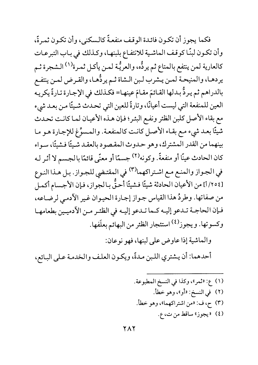 فكما يجوز أن تكون فائدة الوقف منفعةً كالسكنى، وأن تكون ثمرةً، وأن تكون لبنًا كوقف الماشية للانتفاع بلبنها، وكذلك في باب التبرعات كالعارية لمن ينتفع بالمتاع ثم يردُّه، والعريُّة لمن يأكل ثمرة (¬١) الشجرة ثم يردها، والمنيحة لمن يشرب لبن الشاة ثم يردُّها، والقرض لمن ينتفع بالدراهم ثم يردُّ بدلها القائمَ مقامَ عينها= فكذلك في الإجارة تارةً يكريه العين للمنفعة التي ليست أعيانًا، وتارةً للعين التي تحدث شيئًا من بعد شيء مع بقاء الأصل كلبن الظئر ونفع البئر؛ فإن هذه الأعيان لما كانت تحدث شيئًا بعد شيء مع بقاء الأصل كانت كالمنفعة. والمسوِّغ للإجارة هو ما بينهما من القدر المشترك، وهو حدوث المقصود بالعقد شيئًا فشيئًا، سواء كان الحادث عينًا أو منفعةً. وكونه (¬٢) جسمًا أو معنًى قائمًا بالجسم لا أثر له في الجواز والمنع مع اشتراكهما (¬٣) في المقتضي للجواز. بل هذا النوع [٢٥٤/أ] من الأعيان الحادثة شيئًا فشيئًا أحقُّ بالجواز، فإن الأجسام أكمل من صفاتها. وطردُ هذا القياس جواز إجارة الحيوان غير الآدمي لرضاعه، فإن الحاجة تدعو إليه كما تدعو إليه في الظئر من الآدميين بطعامها وكسوتها. ويجوز (¬٤) استئجار الظئر من البهائم بعلَفها.