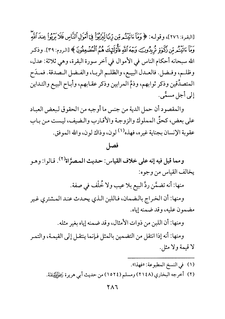[البقرة: ٢٧٦]، وقوله: {وَمَا آتَيْتُمْ مِنْ رِبًا لِيَرْبُوَ فِي أَمْوَالِ النَّاسِ فَلَا يَرْبُو عِنْدَ اللَّهِ وَمَا آتَيْتُمْ مِنْ زَكَاةٍ تُرِيدُونَ وَجْهَ اللَّهِ فَأُولَئِكَ هُمُ الْمُضْعِفُونَ} [الروم: ٣٩]. وذكر الله سبحانه أحكام الناس في الأموال في آخر سورة البقرة، وهي ثلاثة: عدل، وظلم، وفضل. فالعدل البيع، والظلم الربا، والفضل الصدقة. فمدَح المتصدِّقين وذكر ثوابهم، وذمَّ المرابين وذكر عقابهم، وأباح البيع والتداين إلى أجل مسمًّى.