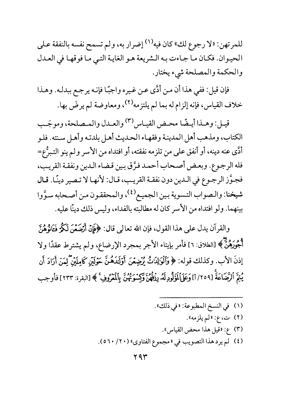 قيل: وهذا أيضًا محض القياس (¬٣) والعدل والمصلحة، وموجَب الكتاب، ومذهب أهل المدينة وفقهاء الحديث أهل بلدته وأهل سنته. فلو أدَّى عنه دينه، أو أنفق على من تلزمه نفقته، أو افتداه من الأسر ولم ينو التبرُّع= فله الرجوع. وبعض أصحاب أحمد فرَّق بين قضاء الدين ونفقة القريب، فجوَّز الرجوع في الدين دون نفقة القريب، قال: لأنها لا تصير دينًا. قال شيخنا: والصواب التسوية بين الجميع (¬٤)، والمحققون من أصحابه سوَّوا بينهما. ولو افتداه من الأسر كان له مطالبته بالفداء، وليس ذلك دينًا عليه.