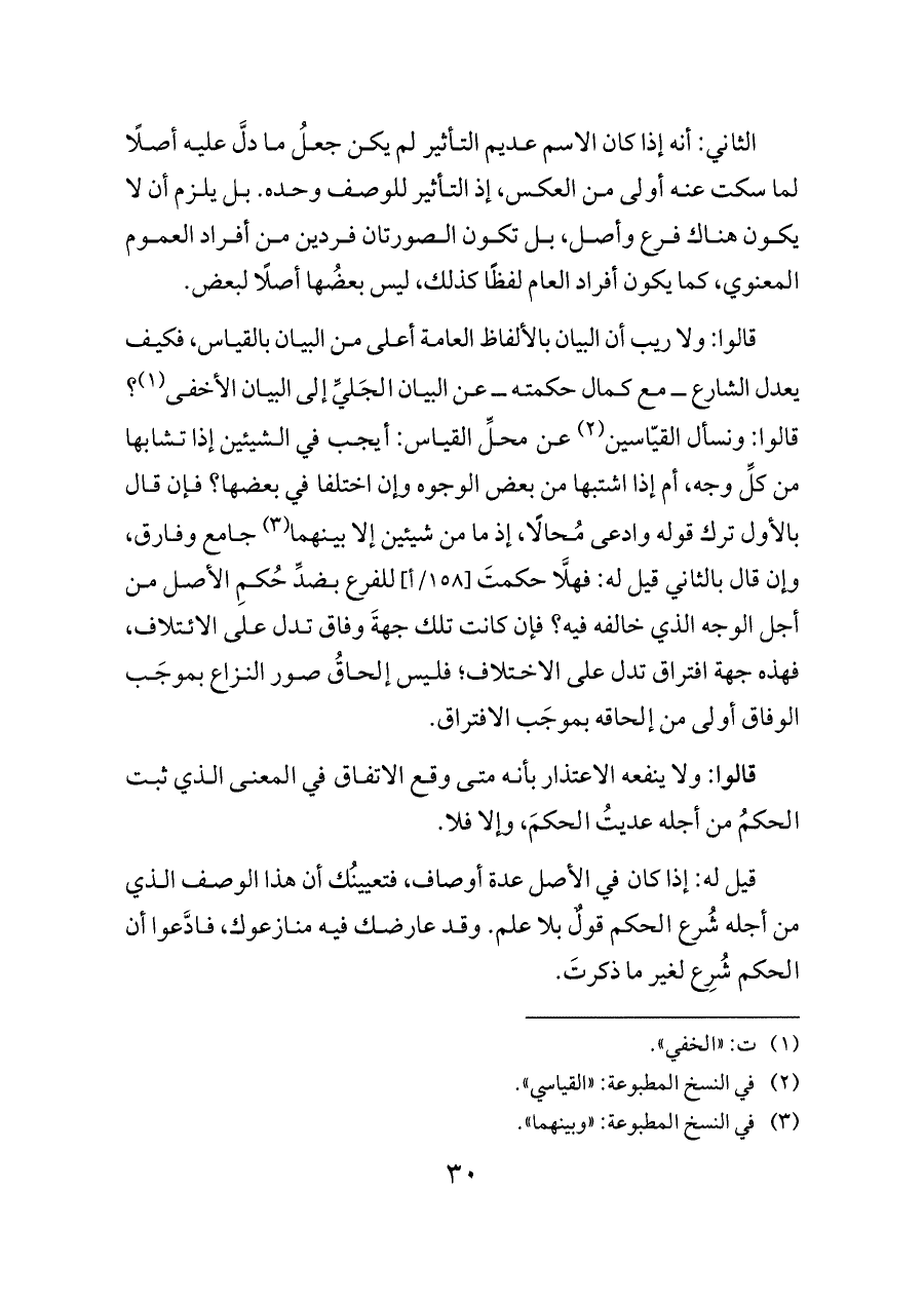 الثاني: أنه إذا كان الاسم عديم التأثير لم يكن جعلُ ما دلَّ عليه أصلًا لما سكت عنه أولى من العكس، إذ التأثير للوصف وحده. بل يلزم أن لا يكون هناك فرع وأصل، بل تكون الصورتان فردين من أفراد العموم المعنوي، كما يكون أفراد العام لفظًا كذلك، ليس بعضُها أصلًا لبعض.