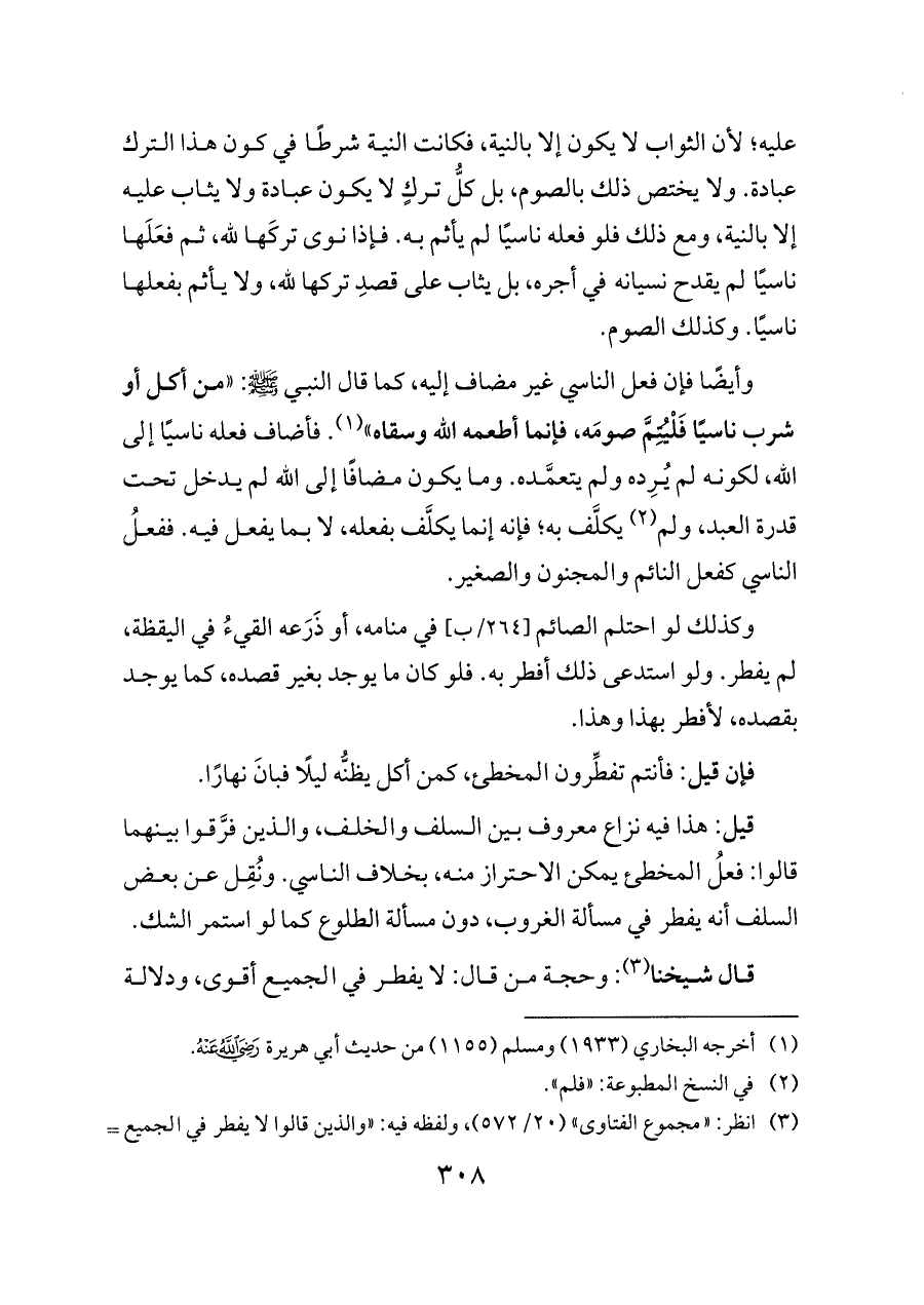 (¬٣) انظر: «مجموع الفتاوى» (٢٠/ ٥٧٢)، ولفظه فيه: «والذين قالوا لا يفطر في الجميع قالوا: حجتنا أقوى، ودلالة الكتاب والسنة على قولنا أظهر».