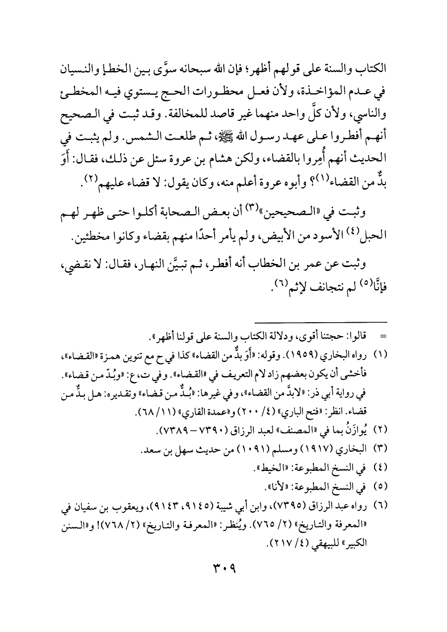 الكتاب والسنة على قولهم أظهر؛ فإن الله سبحانه سوَّى بين الخطإ والنسيان في عدم المؤاخذة، ولأن فعل محظورات الحج يستوي فيه المخطئ والناسي، ولأن كلَّ واحد منهما غير قاصد للمخالفة. وقد ثبت في الصحيح أنهم أفطروا على عهد رسول الله - صلى الله عليه وسلم -، ثم طلعت الشمس. ولم يثبت في الحديث أنهم أُمِروا بالقضاء، ولكن هشام بن عروة سئل عن ذلك، فقال: أَوَ بدٌّ من القضاء (¬١)؟ وأبوه عروة أعلم منه، وكان يقول: لا قضاء عليهم (¬٢).