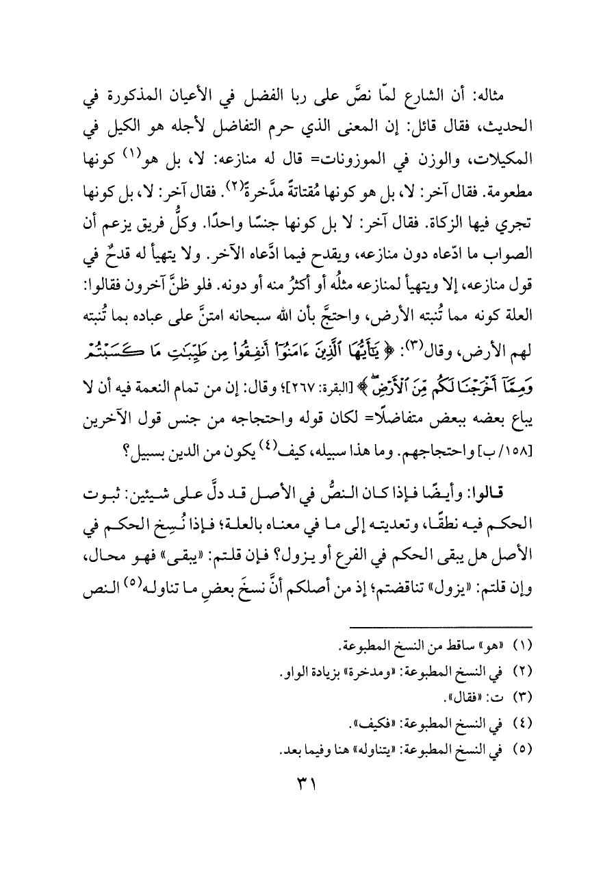 مثاله: أن الشارع لمّا نصَّ على ربا الفضل في الأعيان المذكورة في الحديث، فقال قائل: إن المعنى الذي حرم التفاضل لأجله هو الكيل في المكيلات، والوزن في الموزونات= قال له منازعه: لا، بل هو (¬١) كونها مطعومة. فقال آخر: لا، بل هو كونها مُقتاتةً مدَّخرةً (¬٢). فقال آخر: لا، بل كونها تجري فيها الزكاة. فقال آخر: لا بل كونها جنسًا واحدًا. وكلُّ فريق يزعم أن الصواب ما ادّعاه دون منازعه، ويقدح فيما ادَّعاه الآخر. ولا يتهيأ له قدحٌ في قول منازعه، إلا ويتهيأ لمنازعه مثلُه أو أكثرُ منه أو دونه. فلو ظنَّ آخرون فقالوا: العلة كونه مما تُنبته الأرض، واحتجَّ بأن الله سبحانه امتنَّ على عباده بما تُنبته لهم الأرض، وقال (¬٣): {يَاأَيُّهَا الَّذِينَ آمَنُوا أَنْفِقُوا مِنْ طَيِّبَاتِ مَا كَسَبْتُمْ وَمِمَّا أَخْرَجْنَا لَكُمْ مِنَ الْأَرْضِ} [البقرة: ٢٦٧]؛ وقال: إن من تمام النعمة فيه أن لا يباع بعضه ببعض متفاضلًا= لكان قوله واحتجاجه من جنس قول الآخرين [١٥٨/ب] واحتجاجهم. وما هذا سبيله، كيف (¬٤) يكون من الدين بسبيل؟