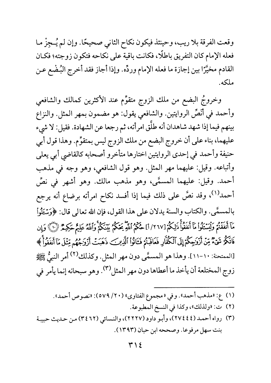 وخروجُ البضع من ملك الزوج متقوِّم عند الأكثرين كمالك والشافعي وأحمد في أنَصِّ الروايتين. والشافعي يقول: هو مضمون بمهر المثل. والنزاع بينهم فيما إذا شهد شاهدان أنه طلَّق امرأته، ثم رجعا عن الشهادة. فقيل: لا شيء عليهما، بناء على أن خروج البضع من ملك الزوج ليس بمتقوِّم. وهذا قول أبي حنيفة وأحمد في إحدى الروايتين اختارها متأخرو أصحابه كالقاضي أبي يعلى وأتباعه. وقيل: عليهما مهر المثل. وهو قول الشافعي، وهو وجه في مذهب أحمد. وقيل: عليهما المسمَّى، وهو مذهب مالك. وهو أشهر في نصِّ أحمد (¬١)، وقد نصَّ على ذلك فيما إذا أفسد نكاح امرأته برضاع أنه يرجع بالمسمَّى. والكتاب والسنة يدلان على هذا القول، فإن الله تعالى قال: {وَاسْأَلُوا مَا أَنْفَقْتُمْ وَلْيَسْأَلُوا مَا أَنْفَقُوا ذَلِكُمْ [٢٦٧/أ] حُكْمُ اللَّهِ يَحْكُمُ بَيْنَكُمْ وَاللَّهُ عَلِيمٌ حَكِيمٌ (١٠) وَإِنْ فَاتَكُمْ شَيْءٌ مِنْ أَزْوَاجِكُمْ إِلَى الْكُفَّارِ فَعَاقَبْتُمْ فَآتُوا الَّذِينَ ذَهَبَتْ أَزْوَاجُهُمْ مِثْلَ مَا أَنْفَقُوا} [الممتحنة: ١٠ - ١١]. وهذا هو المسمَّى دون مهر المثل. وكذلك (¬٢) أمر النبيُّ - صلى الله عليه وسلم - زوج المختلعة أن يأخذ ما أعطاها دون مهر المثل (¬٣). وهو سبحانه إنما يأمر في