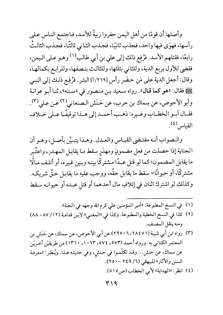 وأصلها أن قومًا من أهل اليمن حفروا زبيةً للأسد، فاجتمع الناس على رأسها، فهوَى فيها واحد، فجذب ثانيًا، فجذب الثاني ثالثًا، فجذب الثالثُ رابعًا، فقتلهم الأسد. فرُفِع ذلك إلى علي بن أبي طالب (¬١) وهو على اليمن، فقضى للأول بربع الدية، وللثاني بثلثها، وللثالث بنصفها، وللرابع بكمالها، وقال: أجعل الدية على مَن حضَر رأس [٢٦٩/أ] البئر. فرُفِع ذلك إلى النبي - صلى الله عليه وسلم - فقال: «هو كما قال». رواه سعيد بن منصور في «سننه»، ثنا أبو عوانة وأبو الأحوص، عن سِماك بن حرب، عن حَنَش الصنعاني (¬٢) عن علي (¬٣). فقال أبو الخطاب وغيره: ذهب أحمد إلى هذا توقيفًا على خلاف القياس (¬٤).