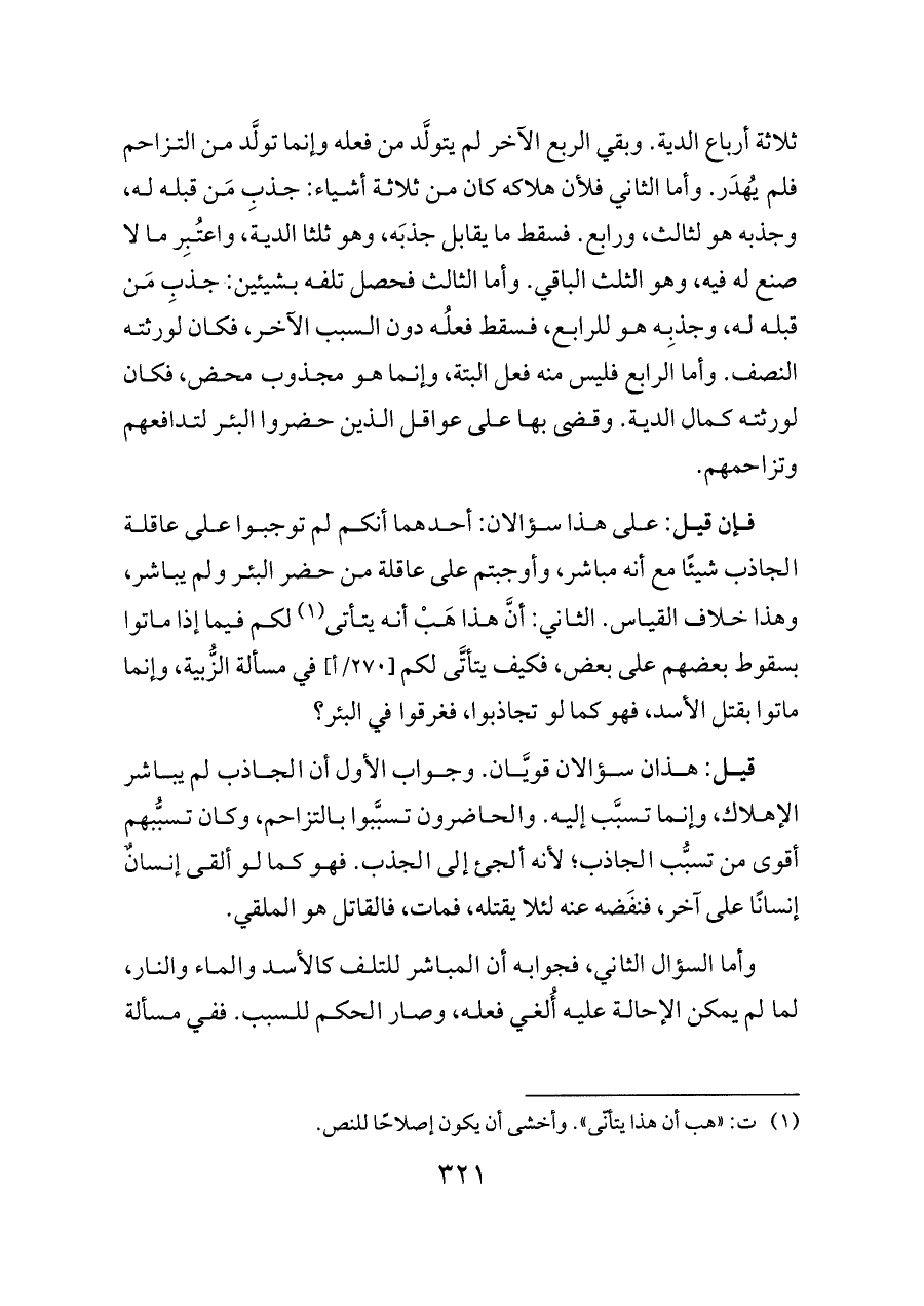 قيل: هذان سؤالان قويَّان. وجواب الأول أن الجاذب لم يباشر الإهلاك، وإنما تسبَّب إليه. والحاضرون تسبَّبوا بالتزاحم، وكان تسبُّبهم أقوى من تسبُّب الجاذب؛ لأنه ألجئ إلى الجذب. فهو كما لو ألقى إنسانٌ إنسانًا على آخر، فنفَضه عنه لئلا يقتله، فمات، فالقاتل هو الملقي.