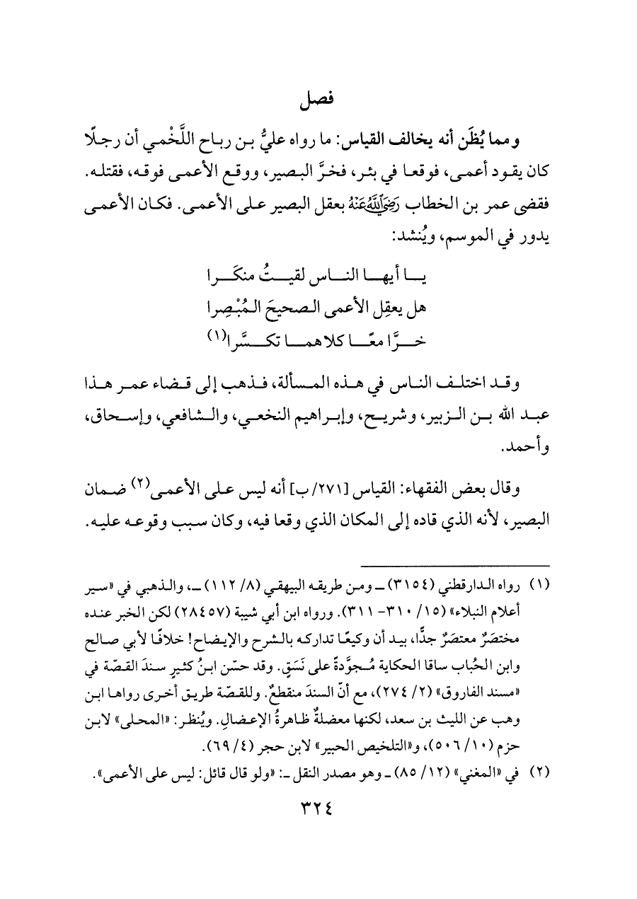ومما يُظَن أنه يخالف القياس: ما رواه عليُّ بن رباح اللَّخْمي أن رجلًا كان يقود أعمى، فوقعا في بئر، فخرَّ البصير، ووقع الأعمى فوقه، فقتله. فقضى عمر بن الخطاب - رضي الله عنه - بعقل البصير على الأعمى. فكان الأعمى يدور في الموسم، ويُنشد:
