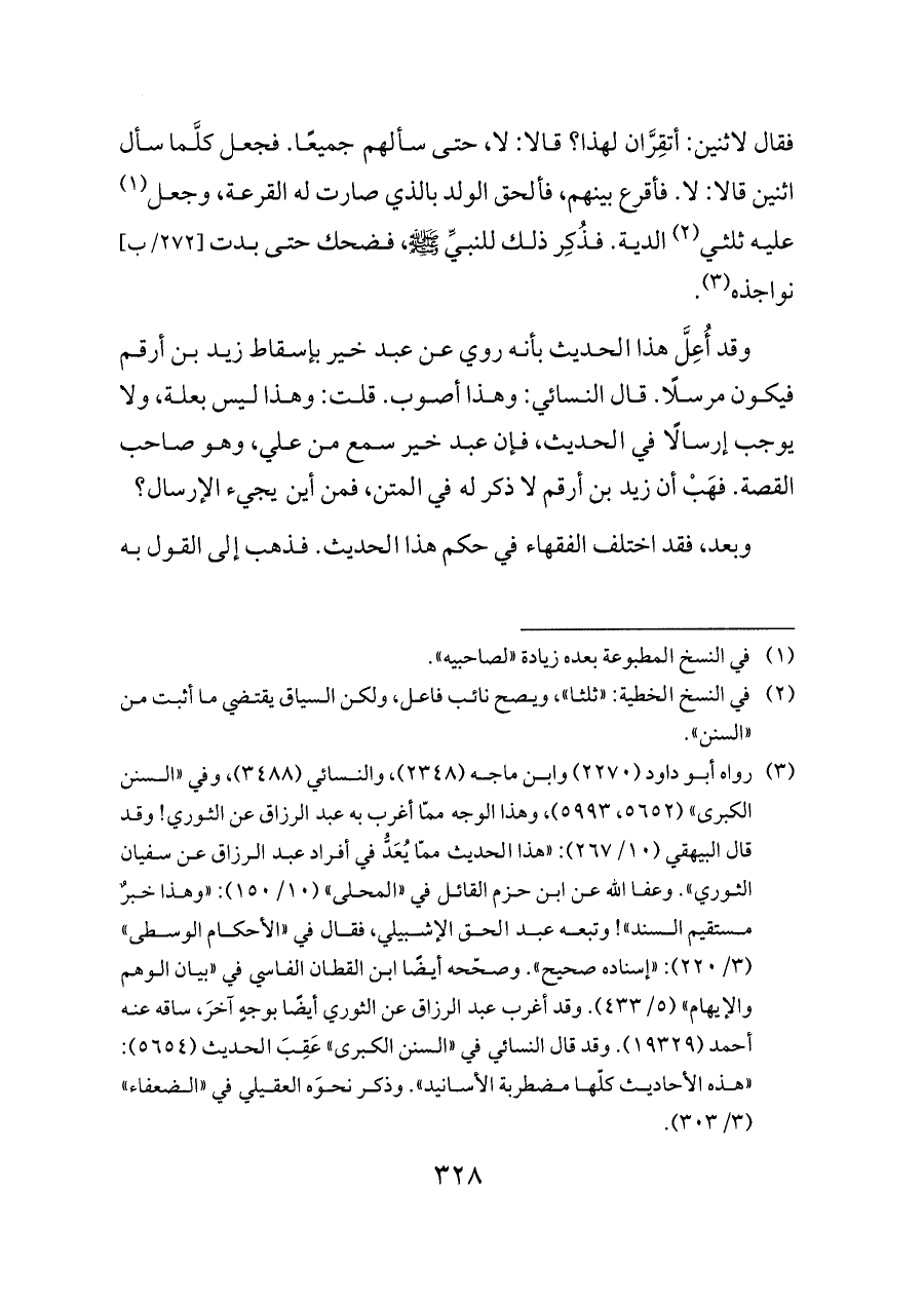 وقد أُعِلَّ هذا الحديث بأنه روي عن عبد خير بإسقاط زيد بن أرقم فيكون مرسلًا. قال النسائي: وهذا أصوب. قلت: وهذا ليس بعلة، ولا يوجب إرسالًا في الحديث، فإن عبد خير سمع من علي، وهو صاحب القصة. فهَبْ أن زيد بن أرقم لا ذكر له في المتن، فمن أين يجيء الإرسال؟