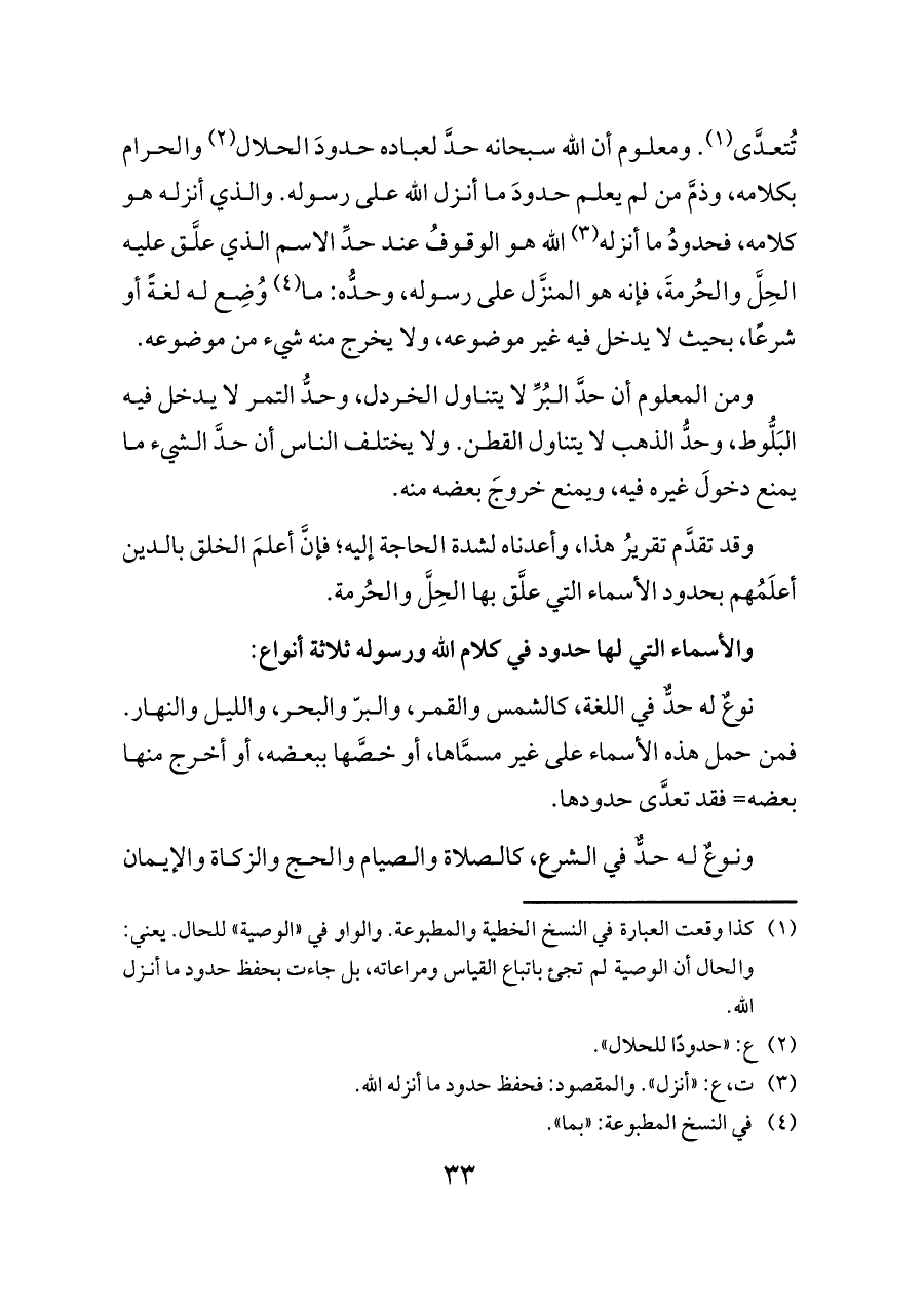 وقد تقدَّم تقريرُ هذا، وأعدناه لشدة الحاجة إليه؛ فإنَّ أعلمَ الخلق بالدين أعلَمُهم بحدود الأسماء التي علَّق بها الحِلَّ والحُرمة.