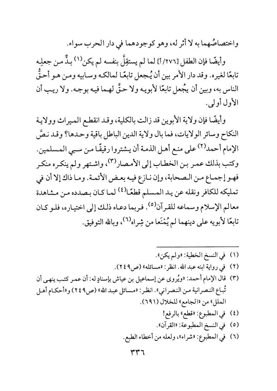 وأيضًا فإن ولاية الأبوين قد زالت بالكلية، وقد انقطع الميراث وولاية النكاح وسائر الولايات، فما بال ولاية الدين الباطل باقية وحدها؟ وقد نصَّ الإمام أحمد (¬٢) على منع أهل الذمة أن يشتروا رقيقًا من سبي المسلمين. وكتب بذلك عمر بن الخطاب إلى الأمصار (¬٣)، واشتهر ولم ينكره منكر فهو إجماع من الصحابة، وإن نازع فيه بعض الأئمة. وما ذاك إلا أن في تمليكه للكافر ونقله عن يد المسلم قطعًا (¬٤) لما كان بصدده من مشاهدة معالم الإسلام وسماعه للقرآن (¬٥). فربما دعاه ذلك إلى اختياره، فلو كان تابعًا لأبويه على دينهما لم يُمْنَعا من شِراه (¬٦)، وبالله التوفيق.